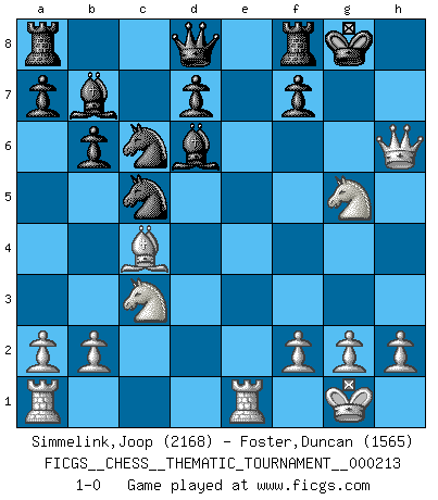 Last move : 1-0 2017 January 2 22:38:43 [Event "FICGS__CHESS__THEMATIC_TOURNAMENT__000213"] [Site "FICGS"] [Date "2016.11.29"] [Round "1"] [White "Simmelink,Joop"] [Black "Foster,Duncan"] [Result "1-0"] [WhiteElo "2168"] [BlackElo "1565"] 1.e4 e5 2.Nf3 Nc6 3.Nc3 Nf6 4.d4 exd4 5.Nd5 Nxe4 6.Bd3 Nc5 7.O-O h6 8.Re1+ Ne6 9.Bd2 Bd6 10.c3 O-O 11.cxd4 b6 12.Nc3 Nb4 13.Bc4 Bb7 14.d5 Nc5 15.Qb1 c6 16.dxc6 Nxc6 17.Bxh6 gxh6 18.Qg6+ Kh8 19.Qxh6+ Kg8 20.Ng5 1-0 Four knights : Belgrade gambit Kingside Castling by player White (move 7) Kingside Castling by player Black (move 10) Player White won this chess game. Follow this game move after move (download)When you are lonely, when you feel yourself an alien in the world, play Chess. This will raise your spirits and be your counselor in war. (Aristotle) Wenn Du einsam bist, wenn Du Dich in der Welt wie ein Fremder fühlst, spiele Schach. Das wird Deinen Geist erheben und Dein Ratgeber im Kampf sein. (Aristoteles) El Ajedrez no es como la vida... ¡tiene reglas!. (Mark Pasternak) La conception d'un plan est le processus par lequel un joueur exploite les avantages de sa position tout en s'efforçant d'en réduire au minimum les inconvénients. Afin de garantir le succès, un plan doit toujours se fonder sur un diagnostic objectif des particularités d'une position. La conception d'un plan est d'autant plus difficile que la position est équilibrée, et grandement facilitée lorsqu'il n'existe qu'un seul plan susceptible de répondre aux exigences de la position. (Harry Golombek) In God we trust, all others we virus scan. (Anonymous)