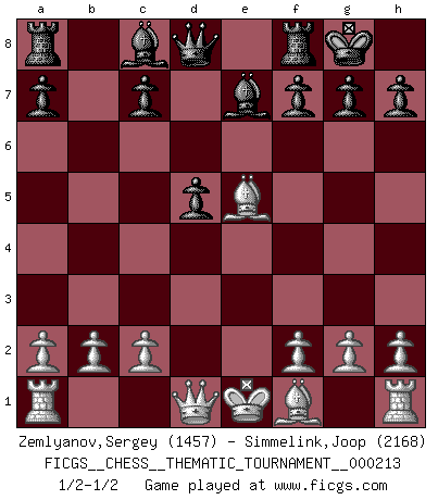 Last move : 1/2-1/2 2017 January 9 12:1:10 [Event "FICGS__CHESS__THEMATIC_TOURNAMENT__000213"] [Site "FICGS"] [Date "2016.11.29"] [Round "1"] [White "Zemlyanov,Sergey"] [Black "Simmelink,Joop"] [Result "1/2-1/2"] [WhiteElo "1457"] [BlackElo "2168"] 1.e4 e5 2.Nf3 Nc6 3.Nc3 Nf6 4.d4 exd4 5.Nd5 Bc5 6.Bg5 Be7 7.Bf4 d6 8.Nxd4 O-O 9.Nc3 d5 10.e5 Nd7 11.Nxd5 Ndxe5 12.Nxc6 bxc6 13.Bxe5 cxd5 1/2-1/2 Four knights : Belgrade gambit Kingside Castling by player Black (move 8) This chess game ended in a draw. Follow this game move after move (download)Chess is really ninety nine percent calculation. (Soltis) Habe Mut, dich deines eigenen Verstandes zu bedienen. (Immanuel Kant) Si yo gano un torneo, yo lo gano por mí mismo. Yo hago las jugadas. Nadie me ayuda. (Bobby Fischer) Il s'avisa de me proposer d'apprendre les échecs qu'il jouait un peu... me voilà forcené des échecs. J'achète un échiquier, je m'enferme dans ma chambre, j'y passe des jours et des nuits à vouloir apprendre par cur toutes les parties. (Jean-Jacques Rousseau, Confessions) If passion drives you, let reason holds the reins. (Benjamin Franklin)