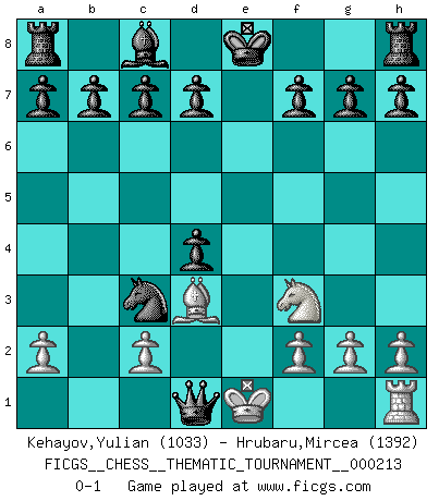 Last move : 0-1 2017 February 18 18:52:25 [Event "FICGS__CHESS__THEMATIC_TOURNAMENT__000213"] [Site "FICGS"] [Date "2016.11.29"] [Round "1"] [White "Kehayov,Yulian"] [Black "Hrubaru,Mircea"] [Result "0-1"] [WhiteElo "1033"] [BlackElo "1392"] 1.e4 e5 2.Nf3 Nc6 3.Nc3 Nf6 4.d4 exd4 5.Nd5 Nb4 6.Nxb4 Bxb4+ 7.Bd2 Qe7 8.Bxb4 Qxb4+ 9.Qd2 Qxb2 10.Qd1 Nxe4 11.Bd3 Nc3 12.Qd2 Qxa1+ 13.Qd1 Qxd1+ 0-1 Four knights : Belgrade gambit Player Black won this chess game. Follow this game move after move (download)The game of Chess is not merely an idle amusement; several very valuable qualities of the mind are to be acquired and strengthened by it, so as to become habits ready on all occasions; for life is a kind of Chess. (Benjamin Franklin) Dass jemand wie Surab Asmaiparaschwili, der selbst Elopunkte gekauft hat , Vize-Präsident der Fide werden konnte, sagt schon einges über den Zustand dieser Organisation aus. (Joel Lautier) Entre mas años cumplo, mas valoro los Peones. (Keres) Un footballeur joue avec ses pieds, parfois avec sa tête. Un joueur d'échecs ne joue qu'avec sa tête. Et quand il ne joue plus, il meurt. (Jacob Murray) Perhaps the current trend of many chess professionals taking up the more lucrative pastime of poker is not a wholly negative one. It may not be too late for humans to relearn how to take risks in order to innovate and thereby maintain the advanced lifestyles we enjoy. And if it takes a poker-playing supercomputer to remind us that we can't enjoy the rewards without taking the risks, so be it. (The Chess Master and the Computer, by Garry Kasparov - 2010)
