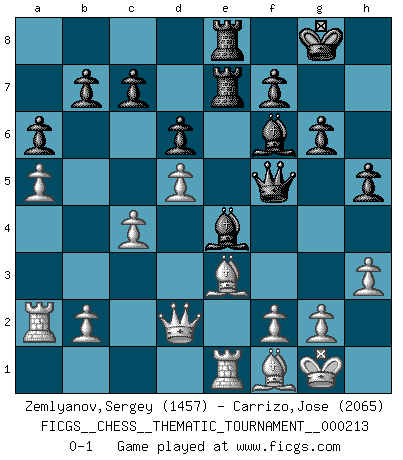 Last move : 0-1 2017 May 24 17:59:24 [Event "FICGS__CHESS__THEMATIC_TOURNAMENT__000213"] [Site "FICGS"] [Date "2016.11.29"] [Round "1"] [White "Zemlyanov,Sergey"] [Black "Carrizo,Jose"] [Result "0-1"] [WhiteElo "1457"] [BlackElo "2065"] 1.e4 e5 2.Nf3 Nc6 3.Nc3 Nf6 4.d4 exd4 5.Nd5 Be7 6.Nxd4 Nxd5 7.exd5 Nxd4 8.Qxd4 O-O 9.Be2 Bf6 10.Qd3 d6 11.O-O Re8 12.Re1 g6 13.c3 Bf5 14.Qd1 Qd7 15.Be3 Re7 16.Qd2 Rae8 17.a4 a6 18.a5 Be4 19.h3 Qf5 20.c4 Qe5 21.Ra2 h5 22.Bf1 Qf5 0-1 This chess game has been lost on time (started : 2016.11.29 22:24:26) Four knights : Belgrade gambit Kingside Castling by player Black (move 8) Kingside Castling by player White (move 11) Player Black won this chess game. Follow this game move after move (download)Methodical thinking is of more use in Chess than inspiration. (C. J. S. Purdy) Schach wird sich dank seiner hohen kulturellen Tradition immer durchsetzen. In näherer Zukunft womöglich sogar als Gegenreaktion auf die maßlose Reizüberflutung im Freizeit- und Spielbereich. (Garry Kasparov) Solo puedes ser bueno en el Ajedrez si amas al juego. (Bobby Fischer) Je fais ceci parce que dans cinquante coups j'obtiendrai cela; je m'appelle Mikhail Moisevitch Botvinnik. (Botvinnik) Experiences are the keys to life. (Daniel Parmet)