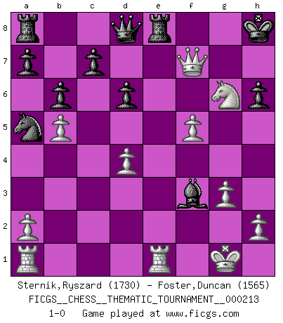 Last move : 1-0 2017 February 25 17:28:12 [Event "FICGS__CHESS__THEMATIC_TOURNAMENT__000213"] [Site "FICGS"] [Date "2016.11.29"] [Round "1"] [White "Sternik,Ryszard"] [Black "Foster,Duncan"] [Result "1-0"] [WhiteElo "1730"] [BlackElo "1565"] 1.e4 e5 2.Nf3 Nc6 3.Nc3 Nf6 4.d4 exd4 5.Nd5 Nxe4 6.Bd3 Nc5 7.O-O h6 8.Re1+ Ne6 9.Bd2 Bc5 10.b4 Bd6 11.c3 O-O 12.cxd4 b6 13.b5 Na5 14.Ne3 Bf4 15.Nf5 Bb7 16.Bxf4 Nxf4 17.Qd2 Nxd3 18.Qxd3 Qf6 19.Ne5 Qg5 20.g3 d6 21.f4 Qd8 22.Ng4 Bc8 23.Ne7+ Kh8 24.f5 Re8 25.Qf3 Bb7 26.Qe2 f6 27.Qe6 Bf3 28.Nxf6 gxf6 29.Qxf6+ Kh7 30.Qf7+ Kh8 31.Ng6+ 1-0 Four knights : Belgrade gambit Kingside Castling by player White (move 7) Kingside Castling by player Black (move 11) Player White won this chess game. Follow this game move after move (download)You can only get good at Chess if you love the game. (Bobby Fischer) Offener Brief an US-Präsident Bush anlässlich der Verhaftung Bobby Fishers: Verhaften Sie mich. Stecken Sie mich in dieselbe Zelle wie Bobby Fisher und geben Sie uns ein Schachspiel mit. (Boris Vassilievich Spassky) El jugador de combinación piensa hacia adelante; comienza de la posición dada y trabaja las movidas contundentes en su mente. (Emanuel Lasker) Comme les marins qui ont mille raisons différentes d'aller en mer, les joueurs d'échecs en ont tout autant avant de s'installer devant une table et jouer... (Vincent Bertignac, philosophe) Don't be discouraged. It's often the last key in the bunch that opens the lock. (Author unknown)