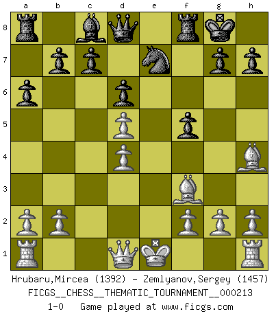Last move : 1-0 2017 April 30 14:3:38 [Event "FICGS__CHESS__THEMATIC_TOURNAMENT__000213"] [Site "FICGS"] [Date "2016.11.29"] [Round "1"] [White "Hrubaru,Mircea"] [Black "Zemlyanov,Sergey"] [Result "1-0"] [WhiteElo "1392"] [BlackElo "1457"] 1.e4 e5 2.Nf3 Nc6 3.Nc3 Nf6 4.d4 exd4 5.Nd5 Bc5 6.Bg5 Be7 7.Bf4 d6 8.Nxd4 O-O 9.Nb5 Nxd5 10.exd5 Ne5 11.Be2 Ng6 12.Bg3 Bf6 13.c3 a6 14.Nd4 Ne7 15.Bf3 Bxd4 16.cxd4 f5 17.Bh4 1-0 This chess game has been lost on time (started : 2016.11.29 22:24:26) Four knights : Belgrade gambit Kingside Castling by player Black (move 8) Player White won this chess game. Follow this game move after move (download)I like the moment when I break a man's ego. (Bobby Fischer) Wenn Du nicht kämpfst, um anderen etwas zu beweisen, sondern nur für Dich selbst, dann bist du fast unbesiegbar. (Garry Kasparov) El pensamiento metódico es mas útil en el Ajedrez que la inspiración. (C. J. S. Purdy) La vie est comme un jeu d'échecs : nous esquissons un plan, mais celui-ci est tributaire de ce que daignent faire l'adversaire aux échecs et le destin dans la vie. (Arthur Schopenhauer) Man is reluctant to give credit for intelligence to anyone, except his enemies. (Albert Einstein)