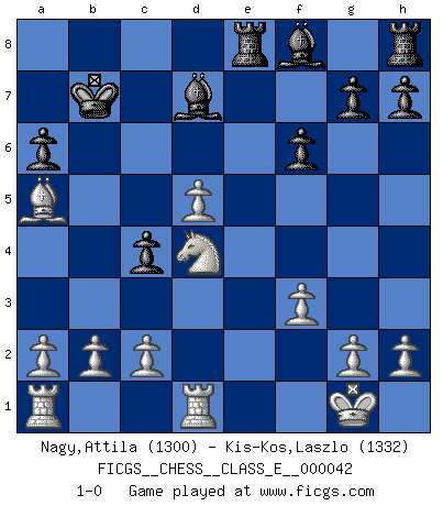 Last move : 1-0 2007 June 10 19:15:35 [Event "FICGS__CHESS__CLASS_E__000042"] [Site "FICGS"] [Date "2007.04.01"] [Round "1"] [White "Nagy,Attila"] [Black "Kis-Kos,Laszlo"] [Result "1-0"] [WhiteElo "1300"] [BlackElo "1332"] 1.e4 e5 2.Nf3 Nc6 3.Bb5 a6 4.Bxc6 dxc6 5.O-O f6 6.d4 exd4 7.Nxd4 c5 8.Nb3 Qxd1 9.Rxd1 Bg4 10.f3 Bd7 11.Nc3 b6 12.Bf4 O-O-O 13.Nd5 c4 14.Nd4 Ne7 15.Bxc7 Re8 16.Bxb6 Nxd5 17.exd5 Kb7 18.Ba5 1-0 Ruy Lopez : Exchange, Gligoric variation Kingside Castling by player White (move 5) Queenside Castling by player Black (move 12) Player White won this chess game. Follow this game move after move (download)Half the variations which are calculated in a tournament game turn out to be completely superfluous. Unfortunately, no one knows in advance which half. (Jan Tinman) Deine Wertungszahl - vorausgesetzt einige Jahre schachliche Anstrengung - entspricht etwa dem zehnfachen Deines IQ plus 1000. (Jonathan Levitt) Por tratar de evitar la pérdida de una pieza, muchas personas han perdido una partida de Ajedrez. (Savielly Tartakover) Les échecs sont un jeu par leur forme, un art par leur essence et une science par sa difficulté d'acquisition. Ils peuvent vous procurer autant de plaisir qu'un bon livre ou une belle musique, mais vous n'aurez une réelle joie que si vous arrivez à bien jouer. (Tigran Petrosian) Don't be discouraged. It's often the last key in the bunch that opens the lock. (Author unknown)
