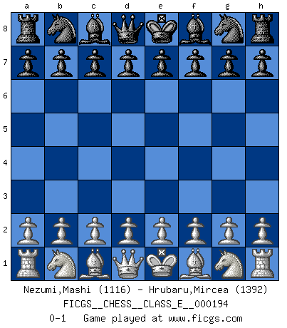 Last move : 0-1 2017 January 9 11:11:42 [Event "FICGS__CHESS__CLASS_E__000194"] [Site "FICGS"] [Date "2016.11.30"] [Round "1"] [White "Nezumi,Mashi"] [Black "Hrubaru,Mircea"] [Result "0-1"] [WhiteElo "1116"] [BlackElo "1392"] 0-1 This chess game has been lost on time (started : 2016.11.30 2:40:22) Player Black won this chess game. Follow this game move after move (download)A bad plan is better than none at all. (Frank Marshall) Sie führen leise Selbstgespräche, schlürfen lautstark ihre Getränke, schmatzen hörbar beim Essen, blasen ihrem Gegenüber Rauch in die Augen, niesen ihm ins Gesicht, starren ihn unverwandt an, bis er sich unter ihren Blicken windet, rutschen ständig auf ihrem Stuhl hin und her, rülpsen und bohren in der Nase. (Anonymous) El Ajedrez por encima de todo... ¡es una pelea!. (Emanuel Lasker) Les Echecs sont affaire de jugement sensible. Savoir quand frapper et quand esquiver. (Fischer) Tree pose grows confidence. It roots me to this world. (Terri Guillemets)