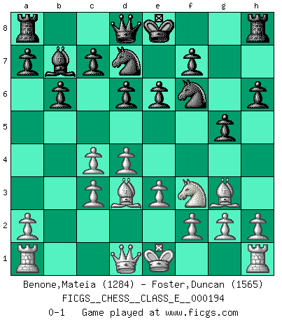 Last move : 0-1 2017 March 26 9:56:45 [Event "FICGS__CHESS__CLASS_E__000194"] [Site "FICGS"] [Date "2016.11.30"] [Round "1"] [White "Benone,Mateia"] [Black "Foster,Duncan"] [Result "0-1"] [WhiteElo "1284"] [BlackElo "1565"] 1.Nf3 b6 2.d4 Bb7 3.c4 e6 4.Nc3 Bb4 5.Bg5 Nf6 6.e3 h6 7.Bh4 Bxc3+ 8.bxc3 d6 9.Bd3 g5 10.Bg3 Nbd7 0-1 This chess game has been lost on time (started : 2016.11.30 2:40:22) Reti Opening Player Black won this chess game. Follow this game move after move (download)If you aren't afraid of Spassky, then I have removed the element of money. (Jim Slater) Wenn Du einsam bist, wenn Du Dich in der Welt wie ein Fremder fühlst, spiele Schach. Das wird Deinen Geist erheben und Dein Ratgeber im Kampf sein. (Aristoteles) La enorme capacidad mental, en la que sin ella no puede un jugador de Ajedrez existir, es demasiado requerida por el Ajedrez al grado de que nunca podrá liberar su mente de este juego. (Albert Einstein) La vérité est comme le meilleur coup aux échecs : elle existe, mais il faut la chercher. (Arturo Perez-Reverte) All men can see these tactics whereby I conquer, but what none can see is the strategy out of which victory is evolved. (Sun Tzu)