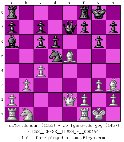 Last move : 1-0 2017 March 12 7:45:14 [Event "FICGS__CHESS__CLASS_E__000194"] [Site "FICGS"] [Date "2016.11.30"] [Round "1"] [White "Foster,Duncan"] [Black "Zemlyanov,Sergey"] [Result "1-0"] [WhiteElo "1565"] [BlackElo "1457"] 1.e4 e5 2.Nf3 Nc6 3.d4 exd4 4.Nxd4 Nf6 5.Nxc6 bxc6 6.e5 Qe7 7.Qe2 Nd5 8.c4 Ba6 9.b3 g6 10.Bb2 Bg7 11.g3 O-O 12.Bh3 d6 13.O-O Bxe5 14.Bxe5 1-0 This chess game has been lost on time (started : 2016.11.30 2:40:22) Scotch : Mieses variation Kingside Castling by player Black (move 11) Kingside Castling by player White (move 13) Player White won this chess game. Follow this game move after move (download)In Chess, as it is played by masters, chance is practically eliminated. (Emanuel Lasker) Ich moechte nie einem Club beitreten, der Leute wie mich als Mitglieder aufnimmt. (Woody Allen) Una clavada es mas poderosa que una espada. (Fred Reinfeld) Comme les marins qui ont mille raisons différentes d'aller en mer, les joueurs d'échecs en ont tout autant avant de s'installer devant une table et jouer... (Vincent Bertignac, philosophe) The problem with manipulation is that people can turn on you. (Horatio Caine, C.S.I. Miami)