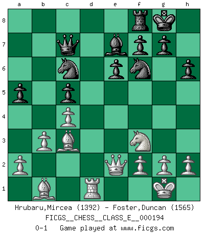 Last move : 0-1 2017 March 25 20:47:51 [Event "FICGS__CHESS__CLASS_E__000194"] [Site "FICGS"] [Date "2016.11.30"] [Round "1"] [White "Hrubaru,Mircea"] [Black "Foster,Duncan"] [Result "0-1"] [WhiteElo "1392"] [BlackElo "1565"] 1.e4 b6 2.d4 Bb7 3.Nd2 e6 4.Ngf3 Nf6 5.Bd3 d5 6.Qe2 Be7 7.O-O O-O 8.Re1 c5 9.dxc5 bxc5 10.exd5 Bxd5 11.b3 Nc6 12.c4 Bxf3 13.Nxf3 Qc7 14.Bb2 a5 15.Bc2 Nb4 16.Rad1 Rad8 17.Bb1 Rxd1 18.Rxd1 Nc6 19.Bc3 h6 0-1 This chess game has been lost on time (started : 2016.11.30 2:40:22) Owen defense Kingside Castling by player White (move 7) Kingside Castling by player Black (move 7) Player Black won this chess game. Follow this game move after move (download)Chess opens and enriches your mind. (Saudin Robovic) Ich hatte Angst gegen einen russischen Großmeister zu verlieren, und er befürchtete gegen einen kleinen Jungen zu verlieren. (über ein Remis gegen Juri Awerbach). (Robert James Fischer) Solo existe una cosa que Fischer hace en el Ajedrez sin placer: ¡perder!. (Boris Spassky) Horreur, mais aussi harmonie suprême : qu'y avait-il en effet au monde en dehors des échecs ? Le brouillard, l'inconnu, le non-être... (Vladimir Nabokov) Lamb in skin of tiger, still fears the wolf. (Chinese proverb)