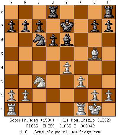 Last move : 1-0 2007 April 12 12:52:23 [Event "FICGS__CHESS__CLASS_E__000042"] [Site "FICGS"] [Date "2007.04.01"] [Round "1"] [White "Goodwin,Adam"] [Black "Kis-Kos,Laszlo"] [Result "1-0"] [WhiteElo "1500"] [BlackElo "1332"] 1.e4 e5 2.Nf3 Nc6 3.d4 exd4 4.Bc4 Bc5 5.c3 dxc3 6.Bxf7+ Kxf7 7.Qd5+ Kf8 8.Qxc5+ Qe7 9.Qxe7+ Ngxe7 10.Nxc3 d6 11.Be3 Bg4 12.Nd4 Nxd4 13.Bxd4 Nc6 14.Be3 Rd8 15.f3 Be6 16.O-O Ke7 17.Bg5+ 1-0 Scotch gambit Kingside Castling by player White (move 16) Player White won this chess game. Follow this game move after move (download)Personally, I rather look forward to a computer program winning the world Chess Championship. Humanity needs a lesson in humility. (Richard Dawkings) Ich würde mich als ganz normalen Jungen bezeichnen [Im Alter von 12]. (Sergej Karjakin) El Ajedrez es un regaderazo frío para la mente. (Sir John Simon) Toutes choses étant égales, c'est la conviction qui gagne. Alliée à une volonté de vaincre, elle sert de détonateur, suscite des idées, disperse les doutes et aide à penser clairement. (Robert Fischer) Train yourself to let go of everything you fear to lose. (Master Yoda in Star Wars ep.3)