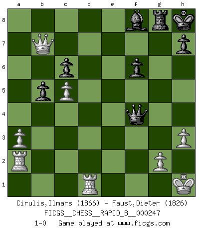 Last move : 1-0 2017 January 7 16:37:7 [Event "FICGS__CHESS__RAPID_B__000247"] [Site "FICGS"] [Date "2016.12.01"] [Round "1"] [White "Cirulis,Ilmars"] [Black "Faust,Dieter"] [Result "1-0"] [WhiteElo "1866"] [BlackElo "1826"] 1.b4 e6 2.a3 Nf6 3.e3 d5 4.Nf3 Nbd7 5.Be2 Bd6 6.c4 dxc4 7.Bxc4 c6 8.d4 b5 9.Be2 a5 10.bxa5 Qxa5+ 11.Nbd2 O-O 12.O-O e5 13.Bb2 exd4 14.Nxd4 Qc7 15.h3 Rd8 16.Qc2 Bb7 17.Rfc1 Nc5 18.Nf5 Bf8 19.Bxf6 gxf6 20.Nf3 Rd5 21.N3d4 Ra4 22.Ng3 Kh8 23.Bg4 Rg5 24.Nh5 Rg6 25.Bf5 Rh6 26.Nf4 Rxd4 27.exd4 Qxf4 28.dxc5 Rh5 29.Qb3 Rxf5 30.Qxf7 Qxf2+ 31.Kh1 Rg5 32.Ra2 Qf4 33.Rd1 Rg8 34.Qxb7 1-0 Polish (Sokolsky) opening Kingside Castling by player Black (move 11) Kingside Castling by player White (move 12) Player White won this chess game. Follow this game move after move (download)Fischer wanted to give the Russians a taste of their own medicine. (Larry Evans) Im Schach gewinnt jeder. Hat man Freunde am Spiel - und das ist die Hauptsache - ist auch der Verlust einer Partie kein Unglück. (David Bronstein) ¿Esta Bobby Fischer algo cuerdo?. (Salo Flohr) Les échecs, c'est la lutte contre l'erreur. (Johannes Zukertort) If you ain't just a little scared when you enter a casino, you are either very rich or you haven't studied the games enough. (Pappy)