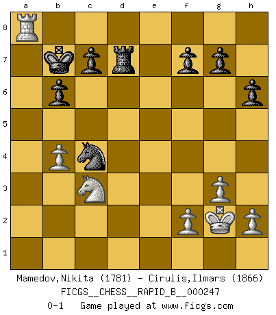 Last move : 0-1 2017 January 16 2:16:56 [Event "FICGS__CHESS__RAPID_B__000247"] [Site "FICGS"] [Date "2016.12.01"] [Round "1"] [White "Mamedov,Nikita"] [Black "Cirulis,Ilmars"] [Result "0-1"] [WhiteElo "1781"] [BlackElo "1866"] 1.d4 e6 2.e4 d5 3.exd5 exd5 4.c4 Nf6 5.cxd5 Nxd5 6.Nf3 Bb4+ 7.Bd2 Qe7+ 8.Qe2 Bxd2+ 9.Nbxd2 Be6 10.a3 Nc6 11.g3 O-O-O 12.Bg2 Bf5 13.Qxe7 Ndxe7 14.O-O h6 15.Nb3 Be6 16.Nc5 Bd5 17.Rfe1 Nf5 18.Rad1 Rhe8 19.b4 Rxe1+ 20.Rxe1 b6 21.Ne4 Ncxd4 22.Nxd4 Nxd4 23.Nc3 Bxg2 24.Kxg2 Nc2 25.Re2 Nxa3 26.Ra2 Nc4 27.Rxa7 Rd7 28.Ra8+ Kb7 0-1 Queen's pawn Queenside Castling by player Black (move 11) Kingside Castling by player White (move 14) Player Black won this chess game. Follow this game move after move (download)Chess is a forcing house where the fruits of character can ripen more fully than in life. (Edward Morgan Foster) Deine Wertungszahl - vorausgesetzt einige Jahre schachliche Anstrengung - entspricht etwa dem zehnfachen Deines IQ plus 1000. (Jonathan Levitt) La enorme capacidad mental, en la que sin ella no puede un jugador de Ajedrez existir, es demasiado requerida por el Ajedrez al grado de que nunca podrá liberar su mente de este juego. (Albert Einstein) Il n'y a pas de prix trop élevé au scalp de l'ennemi. (Koblentz) All art requires courage. (Anne Tucker)