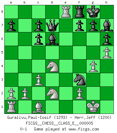 Last move : 0-1 2006 July 9 16:27:54 [Event "FICGS__CHESS__CLASS_E__000005"] [Site "FICGS"] [Date "2006.05.31"] [Round "1"] [White "Guralivu,Paul-Iosif"] [Black "Herr,Jeff"] [Result "0-1"] [WhiteElo "1293"] [BlackElo "1200"] 1.e4 e5 2.Nf3 Nc6 3.Bb5 Nf6 4.O-O d6 5.Re1 Bg4 6.h3 Bh5 7.c3 Be7 8.d4 O-O 9.Bxc6 bxc6 10.g4 Bg6 11.dxe5 Nxe4 12.exd6 Bxd6 13.h4 h6 14.h5 Bh7 15.Nd4 Qd7 16.Qf3 Rae8 17.Nd2 Ng5 18.Rxe8 Nxf3+ 0-1 Ruy Lopez : Berlin defense, 4.O-O, d6 Kingside Castling by player White (move 4) Kingside Castling by player Black (move 8) Player Black won this chess game. Follow this game move after move (download)I guess a certain amount of temperament is expected of Chess geniuses. (Ron Gross) Wenn ich gewinne bin ich ein Genie. Wenn nicht, dann bin ich keines. (Robert James Fischer) Ayuda a tus piezas para que ellas te puedan ayudar. (Paul Morphy) Le jeu d'échecs fait naître et fortifie en nous plusieurs qualités précieuses dans le cours de l'existence, telles que la prévoyance, la circonspection, la prudence, et la persévérance. (Benjamin Franklin - 1783, la morale des échecs) The weakness of an artist is dogma. (Josh Waitzkin)