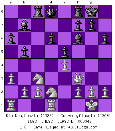 Last move : 1-0 2007 June 26 8:54:17 [Event "FICGS__CHESS__CLASS_E__000042"] [Site "FICGS"] [Date "2007.04.01"] [Round "1"] [White "Kis-Kos,Laszlo"] [Black "Cabrera,Claudio"] [Result "1-0"] [WhiteElo "1332"] [BlackElo "1309"] 1.e4 c5 2.Nf3 Nc6 3.d4 cxd4 4.Nxd4 Nf6 5.Nc3 e6 6.Ndb5 d6 7.Be2 a6 8.Na3 b5 9.Bf3 Bb7 10.Nab1 Be7 11.a3 Ne5 12.Bf4 Nxf3+ 13.Qxf3 O-O 14.O-O e5 15.Bg5 Rc8 16.Nd2 h6 17.Bxf6 Bxf6 18.Rfd1 1-0 This chess game has been lost on time (started : 2007.04.01 1:8:27) Sicilian defense Kingside Castling by player Black (move 13) Kingside Castling by player White (move 14) Player White won this chess game. Follow this game move after move (download)Why must I lose to this idiot ? (Aron Nimzovich) Versuche, dich von der Sklaverei der Eröffnungsvarianten zu befreien. Stattdessen soll man gewisse Typenpositionen erlernen, die man eingehend analysiert. (Aaron Nimzowitsch) Cuando estes solo, cuando te sientas un extraño en el mundo, juega al Ajedrez. Esto levantará tu espiritu y será tu consejero de guerra. (Aristóteles) Il (Jacob Murray) ne joue pas pour le bon coup, mais pour le meilleur. (Eloi Relange) Man is reluctant to give credit for intelligence to anyone, except his enemies. (Albert Einstein)