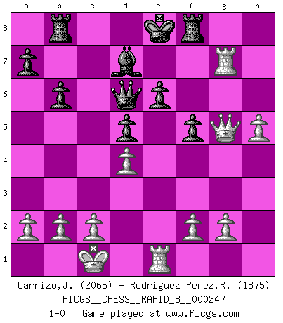 Last move : 1-0 2017 February 15 13:49:54 [Event "FICGS__CHESS__RAPID_B__000247"] [Site "FICGS"] [Date "2016.12.01"] [Round "1"] [White "Carrizo,Jose"] [Black "Rodriguez Perez,Rene"] [Result "1-0"] [WhiteElo "2065"] [BlackElo "1875"] 1.e4 e6 2.d4 d5 3.Nc3 Nf6 4.Bg5 dxe4 5.Nxe4 Be7 6.Bxf6 Bxf6 7.Nf3 O-O 8.Qd2 b6 9.O-O-O Bb7 10.Bd3 Nd7 11.h4 Be7 12.Qe2 Nf6 13.Ne5 Nd5 14.Qh5 h6 15.Ng4 Re8 16.Rh3 Bd6 17.Nxd6 Qxd6 18.Rf3 f5 19.Nxh6+ gxh6 20.Qxh6 Rf8 21.Rg3+ Kf7 22.Rg7+ Ke8 23.Bb5+ c6 24.Bc4 Rb8 25.Bxd5 cxd5 26.Re1 Bc8 27.h5 Bd7 28.Qg5 1-0 French : Burn variation Kingside Castling by player Black (move 7) Queenside Castling by player White (move 9) Player White won this chess game. Follow this game move after move (download)When you play Bobby, it is not a question if you win or lose. It is a question if you survive. (Boris Spassky) Man wirke der falschen Auffassung entgegen, als ob jeder Zug Unmittelbares zu leisten habe; auch Werte- und Ruhezüge haben ihre Existenzberechtigung. (Aaron Nimzowitsch) No puedes jugar al Ajedrez si eres de corazón noble. (Proverbio Francés) Psychologiquement, tu dois avoir confiance en toi même, mais cette confiance doit être basée sur des faits. (Robert Fischer) Life doesn't imitate art, it imitates bad television. (Woody Allen)