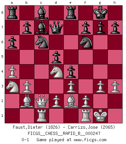Last move : 0-1 2017 February 27 14:56:41 [Event "FICGS__CHESS__RAPID_B__000247"] [Site "FICGS"] [Date "2016.12.01"] [Round "1"] [White "Faust,Dieter"] [Black "Carrizo,Jose"] [Result "0-1"] [WhiteElo "1826"] [BlackElo "2065"] 1.c4 e6 2.a3 d5 3.e3 Nf6 4.Nc3 c6 5.Nf3 Nbd7 6.b3 Bd6 7.Be2 O-O 8.O-O e5 9.cxd5 cxd5 10.a4 Re8 11.h3 Nb8 12.Nb5 e4 13.Nfd4 Be5 14.Bb2 a6 15.Na3 Bc7 16.Rc1 Qd6 17.g3 Qd7 18.Qc2 Nc6 0-1 English Opening Kingside Castling by player Black (move 7) Kingside Castling by player White (move 8) Player Black won this chess game. Follow this game move after move (download)Chess is a cold bath for the mind. (Sir John Simon) Kombinieren und Schwarzhandel gehören verboten. (Savielly Grigorievitsch Tartakower) Si tu oponente no puede hacer nada activo, entonces no apures la posición; En vez de eso, dejalo estar sentado ahí, sufriendo y rogandote por un empate. (Jeremy Silman) Même si l'adversaire joue le coup analysé précédemment, recommencez l'analyse en voyant la nouvelle position. Première règle de Blumenfeld Programmer - an organism that turns coffee into software. (Anonymous)