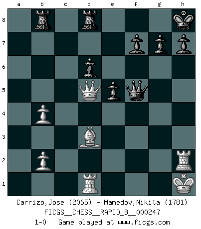 Last move : 1-0 2017 March 22 6:4:50 [Event "FICGS__CHESS__RAPID_B__000247"] [Site "FICGS"] [Date "2016.12.01"] [Round "1"] [White "Carrizo,Jose"] [Black "Mamedov,Nikita"] [Result "1-0"] [WhiteElo "2065"] [BlackElo "1781"] 1.e4 c5 2.Nf3 d6 3.d4 cxd4 4.Nxd4 Nf6 5.Nc3 a6 6.Be2 e5 7.Nb3 Be7 8.O-O Be6 9.f4 Qc7 10.a4 Nbd7 11.Kh1 O-O 12.g4 Bxb3 13.cxb3 Nc5 14.g5 Nfxe4 15.Nd5 Qd8 16.b4 Ne6 17.f5 N6xg5 18.Qd3 Kh8 19.h4 Nf6 20.hxg5 Nxd5 21.Qxd5 Bxg5 22.Bxg5 Qxg5 23.Rf2 Qf6 24.Rd1 Rfd8 25.Rh2 Rab8 26.Bc4 b5 27.axb5 axb5 28.Bxb5 Qxf5 29.Bd3 1-0 Sicilian : Najdorf, Opovcensky variation Kingside Castling by player White (move 8) Kingside Castling by player Black (move 11) Player White won this chess game. Follow this game move after move (download)Chess is a more highly symbolic game, but the aggressions are therefore even more frankly represented in the play. It probably began as a war game; that is, the representation of a miniature battle between the forces of two kingdoms. (Karl Meninger) Mein erstes Ziel war nicht, die Partie zu gewinnen, sondern eine Figur zu opfern. -- der junge (Wilhelm Steinitz) El Ajedrez es el gimnasio de la mente. (Blaise Pascal) La vérité est comme le meilleur coup aux échecs : elle existe, mais il faut la chercher. (Arturo Perez-Reverte) O divine art of subtlety and secrecy! Through you we learn to be invisible, through you inaudible and hence we can hold the enemy's fate in our hands. (Sun Tzu)