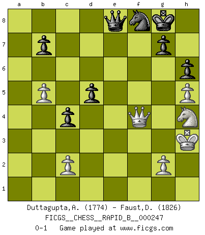 Last move : 0-1 2017 April 16 23:53:6 [Event "FICGS__CHESS__RAPID_B__000247"] [Site "FICGS"] [Date "2016.12.01"] [Round "1"] [White "Duttagupta,Aniruddha"] [Black "Faust,Dieter"] [Result "0-1"] [WhiteElo "1774"] [BlackElo "1826"] 1.d4 e6 2.e4 d5 3.Nc3 Bb4 4.e5 c5 5.Bd2 Ne7 6.Nb5 Bxd2+ 7.Qxd2 O-O 8.dxc5 Nd7 9.Nf3 Nxc5 10.Bd3 Qb6 11.O-O Bd7 12.a4 Nxa4 13.Rxa4 Bxb5 14.Rb4 a6 15.Bxb5 axb5 16.Qd3 Ra5 17.Ng5 Ng6 18.h4 Re8 19.h5 Nf8 20.Rg4 Ra4 21.b4 Qc7 22.Qg3 Rc8 23.Kh2 Ra2 24.Rc1 Qc3 25.f3 f5 26.exf6 Qxf6 27.Rf4 Qh6 28.Qg4 Rc4 29.Rxc4 bxc4 30.Re1 Ra6 31.b5 Rb6 32.f4 Qf6 33.Rb1 e5 34.fxe5 Qxe5+ 35.Kg1 Qe3+ 36.Kh2 Qe8 37.Nf3 Qd7 38.Kh3 Qf7 39.Re1 h6 40.Nh4 Rf6 41.Kg3 Qc7+ 42.Kh3 Rf4 43.Re7 Qxe7 44.Qxf4 Qe8 0-1 This chess game has been lost on time (started : 2016.12.01 6:47:31) Queen's pawn Kingside Castling by player Black (move 7) Kingside Castling by player White (move 11) Player Black won this chess game. Follow this game move after move (download)In Chess, at least, the brave inherit the earth. (Edmar Mednis) Du musst nicht gut spielen, es reicht, wenn du besser spielst als dein Gegner. (Anonymous) La belleza de un movimiento no se refleja solo en su apariencia, sino en el pensamiento detrás de él. (Siegbert Tarrasch) Soyez une menace à chaque fois que vous vous asseyez pour jouer. (Ken Smith) Winning isn't everything... but losing is nothing. (Mednis)