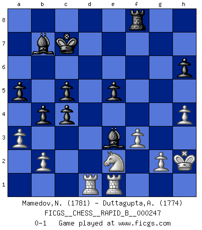 Last move : 0-1 2017 April 13 23:33:35 [Event "FICGS__CHESS__RAPID_B__000247"] [Site "FICGS"] [Date "2016.12.01"] [Round "1"] [White "Mamedov,Nikita"] [Black "Duttagupta,Aniruddha"] [Result "0-1"] [WhiteElo "1781"] [BlackElo "1774"] 1.d4 d5 2.c4 c6 3.Nc3 Nf6 4.Nf3 e6 5.Bg5 h6 6.Bh4 dxc4 7.e4 g5 8.Bg3 b5 9.Be2 Bb7 10.h4 g4 11.Ne5 Nbd7 12.Bxg4 Nxe5 13.Bxe5 Rg8 14.Bf3 Nd7 15.Bg3 Qb6 16.O-O O-O-O 17.Kh1 Bg7 18.Bh5 Rgf8 19.Bd6 Qxd4 20.Qxd4 Bxd4 21.Rad1 e5 22.Bxf8 Rxf8 23.Bg4 Kc7 24.Bxd7 Kxd7 25.Rd2 Kc7 26.Ne2 c5 27.f3 f5 28.exf5 Rxf5 29.Kh2 Rf8 30.a3 Be3 31.R2d1 b4 32.Rfe1 a5 0-1 This chess game has been lost on time (started : 2016.12.01 6:47:31) QGD Slav defense Kingside Castling by player White (move 16) Queenside Castling by player Black (move 16) Player Black won this chess game. Follow this game move after move (download)No other master has such a terrific will to win. At the board he radiates danger, and even the strongest opponents tend to freeze, like rabbits when they smell a panther. Even his weaknesses are dangerous. As white, his opening game is predictable - you can make plans against it - but so strong that your plans almost never work. In the middle game his precision and invention are fabulous, and in the end game you simply cannot beat him. (Anonymous German Expert) Sitze auf Deine Hände. (Siegbert Tarrasch) El Ajedrez es en su esencia, un juego. En su forma, un arte. Y en su ejecución, una ciencia. (Baron Tassilo) Les échecs sont un jeu terrible. Si vous n'avez pas le centre, votre adversaire a une position plus libre. Par contre, si vous avez le centre, alors vous avez vraiment quelque chose pour laquelle vous inquiéter ! (Siegbert Tarrasch) Wikichess, chess moves explained by 'experimented' players. (Thibault de Vassal)
