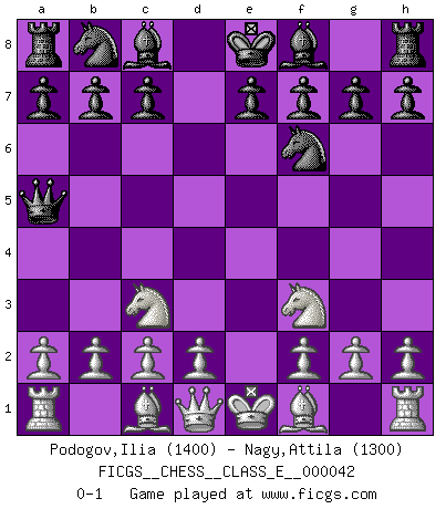 Last move : 0-1 2007 May 14 21:10:7 [Event "FICGS__CHESS__CLASS_E__000042"] [Site "FICGS"] [Date "2007.04.01"] [Round "1"] [White "Podogov,Ilia"] [Black "Nagy,Attila"] [Result "0-1"] [WhiteElo "1400"] [BlackElo "1300"] 1.e4 d5 2.exd5 Qxd5 3.Nc3 Qa5 4.Nf3 Nf6 0-1 This chess game has been lost on time (started : 2007.04.01 1:8:27) Scandinavian (centre counter) defense Player Black won this chess game. Follow this game move after move (download)Openings teach you openings. Endgames teach you chess ! (Stephan Gerzadowicz) Intelligenz läßt sich nicht am Weg, sondern nur am Ergebnis feststellen. (Garry Kasparov) El tablero es el mundo, las piezas es el fenomeno del universo, las reglas del juego son lo que llamamos leyes de la naturaleza y el jugador del lado opuesto, se encuentra oculto a nuestra vista. (Thomas Huxley) Un millionnaire : 'Monsieur Steinitz ! Vous ne participez aux tournois que pour l'argent, alors que moi je n'y viens que pour l'honneur.' Steinitz : 'Chacun joue pour ce qu'il n'a pas'... It's not a bug - it's an undocumented feature. (Anonymous)