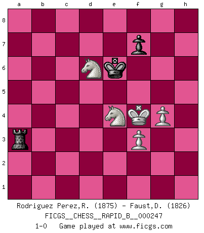 Last move : 1-0 2017 May 28 6:59:42 [Event "FICGS__CHESS__RAPID_B__000247"] [Site "FICGS"] [Date "2016.12.01"] [Round "1"] [White "Rodriguez Perez,Rene"] [Black "Faust,Dieter"] [Result "1-0"] [WhiteElo "1875"] [BlackElo "1826"] 1.e4 e6 2.d4 d5 3.Bd3 dxe4 4.Bxe4 Nf6 5.Bf3 c5 6.Ne2 cxd4 7.Qxd4 Nbd7 8.O-O Bc5 9.Qf4 Qe7 10.Qg3 Bd6 11.Qxg7 Rg8 12.Qh6 Ne5 13.Nd2 Bd7 14.Bxb7 Neg4 15.Qh3 Rb8 16.Bf3 Nxh2 17.Rd1 Nxf3+ 18.Qxf3 Rc8 19.Qb7 h5 20.Nf3 Nd5 21.Ned4 Qf6 22.Rd3 Be7 23.Bd2 Qg7 24.Bg5 Rc7 25.Qa8+ Rc8 26.Qxa7 Bxg5 27.Nxg5 h4 28.Ndf3 Qxb2 29.Rad1 Qb6 30.Qa3 Qc5 31.Qxc5 Rxc5 32.Ne4 Rxc2 33.Rxd5 exd5 34.Nf6+ Kf8 35.Nxd7+ Ke7 36.Nb6 h3 37.g3 Rxa2 38.Nxd5+ Kf8 39.Nf4 Kg7 40.Nxh3 Rga8 41.Kg2 Ra1 42.Rxa1 Rxa1 43.g4 Ra6 44.Nd4 Kf6 45.Kg3 Ra4 46.Nf5 Rb4 47.f3 Ra4 48.Nf2 Ra3 49.Ne4+ Ke5 50.Nfd6 Ke6 51.Kf4 1-0 This chess game has been lost on time (started : 2016.12.01 6:47:31) French : Schlechter variation Kingside Castling by player White (move 8) 10 pieces endgame at move 40 : White KRNNPP , Black KRRP WHITE : King + 1 Rook 2 Knights 2 Pawns BLACK : King + 2 Rooks 1 Pawn 9 pieces endgame at move 42 : White KRNNPP , Black KRP WHITE : King + 1 Rook 2 Knights 2 Pawns BLACK : King + 1 Rook 1 Pawn 8 pieces endgame at move 42 : White KNNPP , Black KRP WHITE : King + 2 Knights 2 Pawns BLACK : King + 1 Rook 1 Pawn Player White won this chess game. Follow this game move after move (download)Chess is imagination. (David Bronstein) Über Frauen: Chess is better. (Robert James Fischer) Los problemas de Ajedrez exigen del compositor las mismas virtudes que caracterizan todo el arte de valor: originalidad, invención, concisión, armonía, complejidad e insinceridad explendida. (Vladimir Nabokov) Une platitude souvent récitée à propos des Echecs est qu'une des choses les plus difficiles à réaliser est de gagner une position gagnante. Cela ne manque pas de sens mais, pour ma part, j'ai toujours trouvé plus difficile de gagner une position perdante. (Tim Krabbe) Go and wake up your luck. (Persian saying)