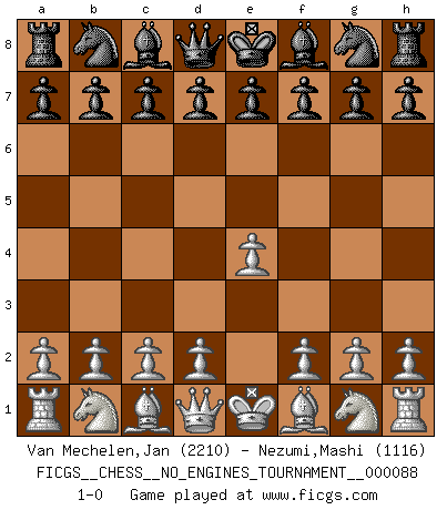 Last move : 1-0 2017 January 13 23:55:32 [Event "FICGS__CHESS__NO_ENGINES_TOURNAMENT__000088"] [Site "FICGS"] [Date "2016.12.04"] [Round "1"] [White "Van Mechelen,Jan"] [Black "Nezumi,Mashi"] [Result "1-0"] [WhiteElo "2210"] [BlackElo "1116"] 1.e4 1-0 This chess game has been lost on time (started : 2016.12.04 15:25:24) King's pawn Opening Player White won this chess game. Follow this game move after move (download)It is not enough to be a good player... you must also play well. (Siegbert Tarrasch) Wenn Dein Gegner dir ein Remis anbietet, versuch herauszufinden, weshalb er glaubt schlechter zu stehen. (Nigel Short) Coloca el contenido del tablero de Ajedrez en un sombrero, agita las piezas vigorosamente, derrámalas en el tablero desde una altura de medio metro y así obtienes el estilo de Wilhelm Steinitz. (H. E. Bird) D'abord les bases : Jouez et étudiez, puis étudiez et jouez, ensuite jouez et étudiez, puis étudiez et jouez. Deuxièmement : Donnez toujours le meilleur de vous-même ! (Ken Smith) When you don't know what to do, walk fast and look worried. (Anonymous)