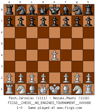 Last move : 1-0 2017 January 13 23:55:32 [Event "FICGS__CHESS__NO_ENGINES_TOURNAMENT__000088"] [Site "FICGS"] [Date "2016.12.04"] [Round "1"] [White "Pech,Jaroslav"] [Black "Nezumi,Mashi"] [Result "1-0"] [WhiteElo "1111"] [BlackElo "1116"] 1.e4 1-0 This chess game has been lost on time (started : 2016.12.04 15:25:24) King's pawn Opening Player White won this chess game. Follow this game move after move (download)My God, Bobby Fischer plays so simply. (Alexei Suetin) Ich verachte Kasparow. (Viktor Kortschnoi) Un Peón pasado es un criminal, quién debe ser mantenido bajo candado y llave. Leves medidas, tales como vigilancia policiaca, no son suficientes. (Aaron Nimzovich) Le génie consiste à savoir transgresser les règles au moment opportun. (Teichmann) The large trees attract high winds. (Chinese proverb)