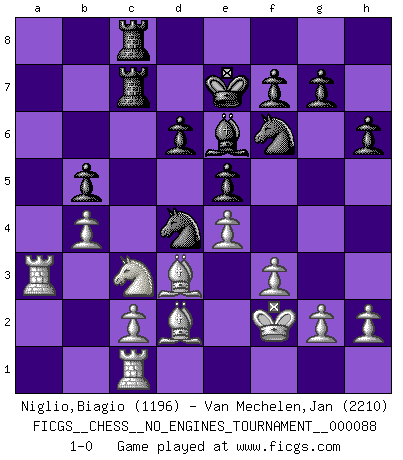 Last move : 1-0 2017 January 1 13:43:57 [Event "FICGS__CHESS__NO_ENGINES_TOURNAMENT__000088"] [Site "FICGS"] [Date "2016.12.04"] [Round "1"] [White "Niglio,Biagio"] [Black "Van Mechelen,Jan"] [Result "1-0"] [WhiteElo "1196"] [BlackElo "2210"] 1.e4 c5 2.Nf3 Nc6 3.d4 cxd4 4.Nxd4 Nf6 5.Nc3 e5 6.Ndb5 h6 7.Nd6+ Bxd6 8.Qxd6 Qe7 9.Qxe7+ Kxe7 10.Be3 d6 11.f3 Be6 12.a3 a6 13.Be2 b5 14.b4 Rac8 15.Bd2 Nd4 16.Bd3 Rc7 17.a4 Bd7 18.axb5 axb5 19.Kf2 Rhc8 20.Ra3 Be6 21.Rc1 1-0 Sicilian : Pelikan (Lasker/Sveshnikov) variation Player White won this chess game. Follow this game move after move (download)In Chess, just as in life, today's bliss may be tomorrow's poison. (Assaic) Ich las kürzlich ein Buch von Nietzsche. Er sagte Religion verdumme nur die Menschen. Ich stimme zu. (Robert James Fischer) Nos gusta pensar. (Gary Kasparov) Toutes choses étant égales, c'est la conviction qui gagne. Alliée à une volonté de vaincre, elle sert de détonateur, suscite des idées, disperse les doutes et aide à penser clairement. (Robert Fischer) Beep ! (R2D2 in Star Wars ep.3)