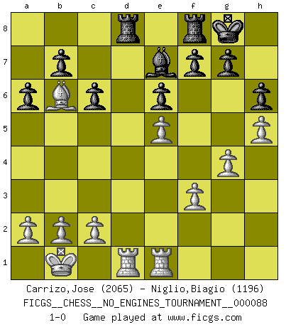 Last move : 1-0 2017 January 31 17:59:25 [Event "FICGS__CHESS__NO_ENGINES_TOURNAMENT__000088"] [Site "FICGS"] [Date "2016.12.04"] [Round "1"] [White "Carrizo,Jose"] [Black "Niglio,Biagio"] [Result "1-0"] [WhiteElo "2065"] [BlackElo "1196"] 1.e4 c6 2.d4 d5 3.Nc3 dxe4 4.Nxe4 Bf5 5.Ng3 Bg6 6.h4 h6 7.Nf3 Nd7 8.h5 Bh7 9.Bd3 Bxd3 10.Qxd3 e6 11.Bf4 Ngf6 12.O-O-O Be7 13.Kb1 O-O 14.Ne4 Nxe4 15.Qxe4 Nf6 16.Qe2 Qd5 17.Ne5 Qe4 18.Qxe4 Nxe4 19.Rhe1 Nf6 20.g4 Rad8 21.f3 Nd7 22.Be3 Nxe5 23.dxe5 a6 24.Bb6 1-0 Caro-Kann : Classical, 7...Nd7 Queenside Castling by player White (move 12) Kingside Castling by player Black (move 13) Player White won this chess game. Follow this game move after move (download)The game of Chess is not merely an idle amusement; several very valuable qualities of the mind are to be acquired and strengthened by it, so as to become habits ready on all occasions; for life is a kind of Chess. (Benjamin Franklin) Besser ein falscher Plan, logisch durchgeführt, als gar kein Plan. (Viktor Kortschnoi) Dios mío, Bobby Fischer juega tan simple. (Alexei Suetin) Je ne crois pas en la psychologie, je crois aux bons coups. (Robert Fischer) To be champion requires more than simply being a strong player; one has to be a strong human being as well. (Anatoly Karpov)