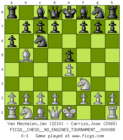 Last move : 0-1 2017 January 1 13:44:9 [Event "FICGS__CHESS__NO_ENGINES_TOURNAMENT__000088"] [Site "FICGS"] [Date "2016.12.04"] [Round "1"] [White "Van Mechelen,Jan"] [Black "Carrizo,Jose"] [Result "0-1"] [WhiteElo "2210"] [BlackElo "2065"] 1.e4 e5 2.Nf3 Nc6 3.Bb5 a6 0-1 Ruy Lopez (Spanish Opening) Player Black won this chess game. Follow this game move after move (download)Chess is a terrible game. If you have no center, your opponent has a freer position. If you do have a center, then you really have something to worry about ! (Siegbert Tarrasch) Der vorletzte Fehler gewinnt. (Savielly Grigorievitsch Tartakower) Yo tuve un dolor de muelas en la primer partida. En el segundo juego, tuve un dolor de cabeza. En el tercero, tuve un ataque de reumatísmo. En la cuarta partida, no me sentía muy bien. ¿Y en el quinto juego? Bueno, ¿que acaso uno tiene que ganar todos los juegos?. (Siegbert Tarrasch) A ce moment-là, je menaçais de comprendre la position ! (Clément L'Heureux) Follow your passion, and success will follow you. (Arthur Buddhold)