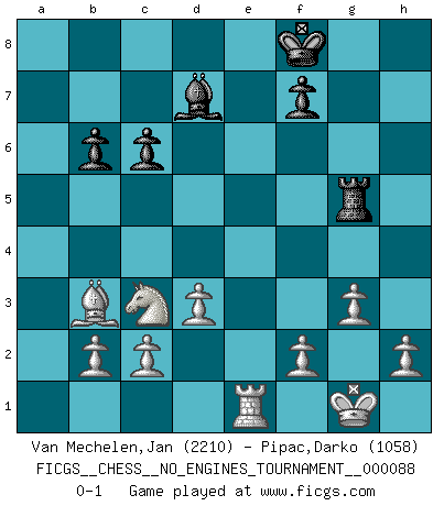 Last move : 0-1 2017 January 1 13:44:17 [Event "FICGS__CHESS__NO_ENGINES_TOURNAMENT__000088"] [Site "FICGS"] [Date "2016.12.04"] [Round "1"] [White "Van Mechelen,Jan"] [Black "Pipac,Darko"] [Result "0-1"] [WhiteElo "2210"] [BlackElo "1058"] 1.e4 e5 2.Nf3 Nc6 3.Bc4 Nf6 4.d3 h6 5.O-O Nd4 6.Nxe5 d5 7.exd5 Nxd5 8.Re1 Ne6 9.Qh5 g6 10.Nxg6 Rg8 11.Nxf8 Kxf8 12.Qxd5 Qxd5 13.Bxd5 c6 14.Bb3 Bd7 15.Nc3 Re8 16.Bxh6+ Ke7 17.g3 Kd8 18.Be3 b6 19.a4 Rg6 20.a5 Ng5 21.Bxg5+ Rxg5 22.Rxe8+ Kxe8 23.axb6 axb6 24.Re1+ Kf8 0-1 Two knights defense (Modern Bishop's Opening) Kingside Castling by player White (move 5) Player Black won this chess game. Follow this game move after move (download)I have added these principles to the law: get the Knights into action before both Bishops are developed. (Emanuel Lasker) Heutzutage gewinnt im Turnier nicht derjenige Spieler, der weitreichende Pläne entwirft, sondern einfach jener, der Zug um Zug kämpft. (David Bronstein) Ciertamente el estado mental actual de Bobby Fischer es una tragedia. Uno de los mas grandes jugadores de Ajedrez del mundo -el orgullo y pena del Ajedrez Americano. (Frank Brady) Les échecs sont un jeu terrible. Si vous n'avez pas le centre, votre adversaire a une position plus libre. Par contre, si vous avez le centre, alors vous avez vraiment quelque chose pour laquelle vous inquiéter ! (Siegbert Tarrasch) In theory there is no difference between theory and practice. In practice there is. (Yogi Berra)