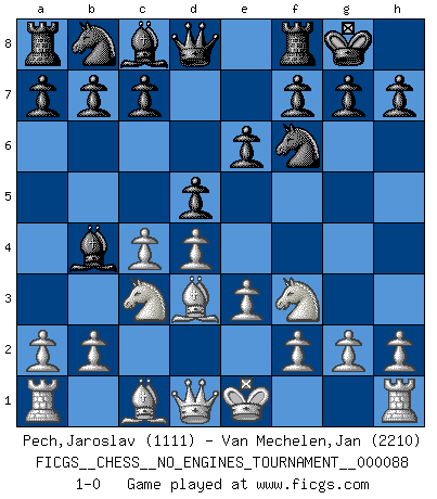 Last move : 1-0 2017 January 14 11:33:57 [Event "FICGS__CHESS__NO_ENGINES_TOURNAMENT__000088"] [Site "FICGS"] [Date "2016.12.04"] [Round "1"] [White "Pech,Jaroslav"] [Black "Van Mechelen,Jan"] [Result "1-0"] [WhiteElo "1111"] [BlackElo "2210"] 1.d4 Nf6 2.c4 e6 3.Nc3 Bb4 4.e3 O-O 5.Bd3 d5 6.Nf3 1-0 Nimzo-Indian : 4.e3 O-O, 5.Bd3 d5 Kingside Castling by player Black (move 4) Player White won this chess game. Follow this game move after move (download)I had a toothache during the first game. In the second game I had a headache. In the third game it was an attack of rheumatism. In the fourth game, I wasn't feeling well. And in the fifth game? Well, must one have to win every game ? (Siegbert Tarrasch) Drei Punkte vor allen anderen ist wie einer, der im weißen Anzug posiert, während der Rest in Müllsäcke gekleidet dasteht. (Viktor Kortschnoi) Por tratar de evitar la pérdida de una pieza, muchas personas han perdido una partida de Ajedrez. (Savielly Tartakover) Le plus grand jeu de l'esprit jamais inventé, plus vous l'apprenez, plus vous y prenez du plaisir. (Garry Kasparov) Life is like internet, nothing interesting, but noone want to leave it. (Ilmars Cirulis)