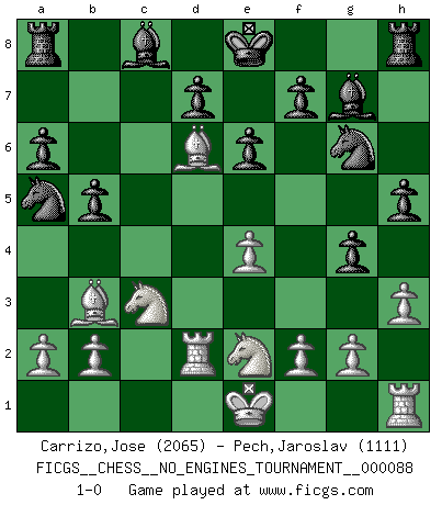 Last move : 1-0 2017 May 27 6:56:8 [Event "FICGS__CHESS__NO_ENGINES_TOURNAMENT__000088"] [Site "FICGS"] [Date "2016.12.04"] [Round "1"] [White "Carrizo,Jose"] [Black "Pech,Jaroslav"] [Result "1-0"] [WhiteElo "2065"] [BlackElo "1111"] 1.e4 c5 2.d4 cxd4 3.c3 dxc3 4.Nxc3 Nc6 5.Nf3 e6 6.Bc4 a6 7.Qe2 b5 8.Bb3 Nge7 9.Bg5 h6 10.Bh4 g5 11.Bg3 Ng6 12.Qd2 Bg7 13.Bd6 g4 14.Ng1 Qg5 15.Rd1 Qxd2+ 16.Rxd2 Na5 17.h3 h5 18.Nge2 1-0 This chess game has been lost on time (started : 2016.12.04 15:25:24) Sicilian : Smith-Morra gambit Player White won this chess game. Follow this game move after move (download)If Chess is a science, it's a most inexact one. If Chess is an art, it is too exacting to be seen as one. If Chess is a sport, it's too esoteric. If Chess is a game, it's too demanding to be just a game. If Chess is a mistress, she's a demanding one. If Chess is a passion, it's a rewarding one. If Chess is life, it's a sad one. (Unknown) Der Vorposten provoziert a) eine Basis für neue Angriffe und b) eine Schwächung der gegnerischen Widerstandskraft in der fraglichen Linie. (Aaron Nimzowitsch) Es el objetivo de la escuela moderna no tratar cada posición de acuerdo a una regla general, sino de acuerdo al principio inherente en la posición. (Richard Reti) On est toujours la mazette de quelqu'un d'autre. (Anonyme) Luck is what you have left over after you give 100 percent. (Langston Coleman)