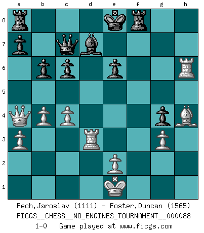 Last move : 1-0 2017 June 15 20:23:10 [Event "FICGS__CHESS__NO_ENGINES_TOURNAMENT__000088"] [Site "FICGS"] [Date "2016.12.04"] [Round "1"] [White "Pech,Jaroslav"] [Black "Foster,Duncan"] [Result "1-0"] [WhiteElo "1111"] [BlackElo "1565"] 1.c4 b6 2.Nc3 Bb7 3.d4 e6 4.a3 f5 5.d5 Nf6 6.g3 Na6 7.Bg2 Nc5 8.Nh3 h6 9.Nf4 g5 10.Ng6 Rg8 11.Nxf8 Rxf8 12.h4 Rg8 13.b4 Nce4 14.Nxe4 Nxe4 15.hxg5 hxg5 16.Bxe4 fxe4 17.dxe6 dxe6 18.Qa4+ c6 19.Bb2 e3 20.Rd1 exf2+ 21.Kxf2 Rf8+ 22.Ke1 Qc7 23.Rd3 g4 24.Rh6 Bc8 25.Bf6 Bd7 26.Bh4 1-0 English Opening Player White won this chess game. Follow this game move after move (download)The enormous mental resilience, without which no Chess player can exist, was so much taken up by Chess that he could never free his mind of this game. (Albert Einstein) Bis zum Jahr 1971 verlief in meiner Schachkariere alles glatt. Dieses dramatische Match [Fischer-Taimanov 6:0] machte mein Leben zur Hölle. (Mark Taimanov) No hay otro maestro que tenga una voluntad terrífica de ganar. Al tablero, el irradía peligro y aún los oponentes mas fuertes tienden a congelarse como liebres cuando olfatean a una pantera. Aún sus debilidades son peligrosas. Con las blancas, su juego de apertura es predecible - te es posible hacer planes en su contra - pero es tan fuerte que tus planes casi nunca funcionan. En el juego medio, su precisión e invención son fabulosas y en finales, tú simplemente no le puedes vencer. (Experto Alemán anónimo) Ne tendez aucun piège pour le plaisir ! Ne jouez rien dans l'espoir que l'adversaire réagisse de façon stupide ! Prenez toujours pour acquis que l'adversaire va trouver le meilleur coup ! Ne jouez jamais de coup dans l'espoir que l'adversaire ne voie pas la menace ! Chacun de vos coups doit améliorer la position d'une façon ou d'une autre. Experience is the name we all give to our mistakes. (Oscar Wilde)