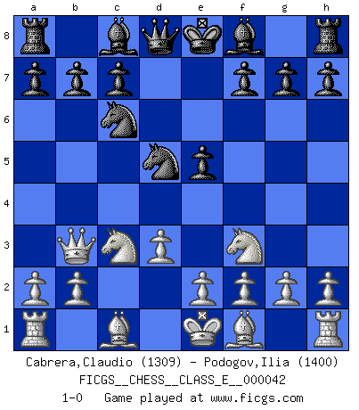 Last move : 1-0 2007 May 21 16:24:9 [Event "FICGS__CHESS__CLASS_E__000042"] [Site "FICGS"] [Date "2007.04.01"] [Round "1"] [White "Cabrera,Claudio"] [Black "Podogov,Ilia"] [Result "1-0"] [WhiteElo "1309"] [BlackElo "1400"] 1.Nf3 Nf6 2.c4 Nc6 3.Nc3 e5 4.d3 d5 5.cxd5 Nxd5 6.Qb3 1-0 This chess game has been lost on time (started : 2007.04.01 1:8:27) Reti Opening Player White won this chess game. Follow this game move after move (download)If I win a tournament, I win it by myself. I do the playing. Nobody helps me. (Bobby Fischer) Ich würde die 30 stärksten Spieler der USA im Simultanspiel besiegen. (José Raúl Capablanca) Nos gusta pensar. (Gary Kasparov) A ce moment-là, je menaçais de comprendre la position ! (Clément L'Heureux) Coffee just isn't my cup of tea. (Unknown)