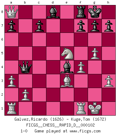 Last move : 1-0 2017 March 20 20:37:7 [Event "FICGS__CHESS__RAPID_D__000102"] [Site "FICGS"] [Date "2016.12.05"] [Round "1"] [White "Galvez,Ricardo"] [Black "Kuge,Tom"] [Result "1-0"] [WhiteElo "1626"] [BlackElo "1672"] 1.e4 e5 2.Nf3 Nf6 3.Nxe5 d6 4.Nf3 Nxe4 5.d4 d5 6.Bd3 Nc6 7.O-O Bg4 8.c4 Be7 9.Nc3 Nf6 10.cxd5 Nxd5 11.Be4 Nf6 12.h3 Bh5 13.Bxc6+ bxc6 14.g4 Bg6 15.Ne5 O-O 16.f4 Be4 17.g5 Bf5 18.Nxc6 Qd7 19.Qf3 Bd8 20.Ne5 Qxd4+ 21.Be3 Qb4 22.Qxa8 Ne4 23.Nxe4 Bxe4 24.a3 1-0 This chess game has been lost on time (started : 2016.12.05 2:0:58) Petrov : Classical attack Kingside Castling by player White (move 7) Kingside Castling by player Black (move 15) Player White won this chess game. Follow this game move after move (download)First-class players lose to second-class players because second-class players sometimes play a first-class game. (Siegbert Tarrasch) Die Fehler sind da, Sie warten nur darauf gemacht zu werden. (Savielly Grigorievitsch Tartakower) Es el objetivo de la escuela moderna no tratar cada posición de acuerdo a una regla general, sino de acuerdo al principio inherente en la posición. (Richard Reti) Les Echecs mettent en conflit, non pas deux intelligences, mais deux volontés. (Lasker) All politicians must be presumed guilty until they are proven innocent. (Dinesh De Silva)