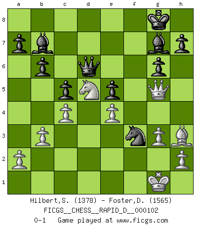 Last move : 0-1 2017 April 21 23:3:17 [Event "FICGS__CHESS__RAPID_D__000102"] [Site "FICGS"] [Date "2016.12.05"] [Round "1"] [White "Hilbert,Stephan J."] [Black "Foster,Duncan"] [Result "0-1"] [WhiteElo "1378"] [BlackElo "1565"] 1.e4 b6 2.c4 Bb7 3.Nc3 e6 4.d3 c5 5.g3 f5 6.Bg2 Be7 7.Nge2 fxe4 8.dxe4 Nf6 9.O-O e5 10.Nd5 O-O 11.Nec3 Nc6 12.b3 d6 13.f4 Nd4 14.fxe5 dxe5 15.Bg5 Nxd5 16.Rxf8+ Qxf8 17.Nxd5 Bxg5 18.Qg4 Bd8 19.Rf1 Qd6 20.Qh5 g6 21.Qh6 Be7 22.Bh3 Rf8 23.Rxf8+ Bxf8 24.Qe3 Bg7 25.Qg5 Nf3+ 0-1 Owen defense Kingside Castling by player White (move 9) Kingside Castling by player Black (move 10) Player Black won this chess game. Follow this game move after move (download)In Chess, as it is played by masters, chance is practically eliminated. (Emanuel Lasker) Ich bin es gewohnt, das die Jugend mir überhaupt keinen Respekt entgegenbringt. (Alexander Morozewich) EL Ajedrez es como la vida. (Boris Spassky) Même si vous avez un bon coup à faire, regardez toujours s'il n'y en a pas un qui lui soit préférable. (Pedro Damiano) Panic is a sudden desertion of us, an a going over to the enemy of our imagination. (Christian Nevell Bovee)