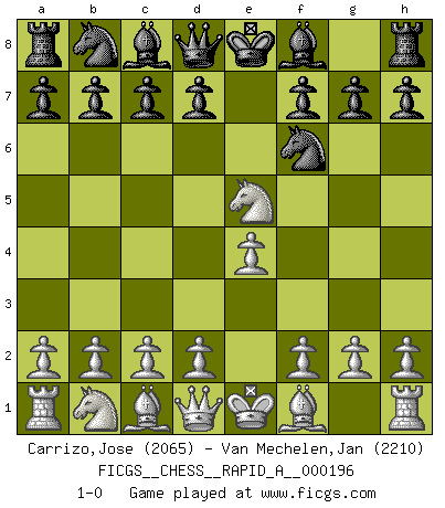 Last move : 1-0 2017 January 1 13:44:24 [Event "FICGS__CHESS__RAPID_A__000196"] [Site "FICGS"] [Date "2016.12.10"] [Round "1"] [White "Carrizo,Jose"] [Black "Van Mechelen,Jan"] [Result "1-0"] [WhiteElo "2065"] [BlackElo "2210"] 1.e4 e5 2.Nf3 Nf6 3.Nxe5 1-0 Petrov's defense Player White won this chess game. Follow this game move after move (download)Chess, like love, like music, has the power to make people happy. (Siegbert Tarrasch) Heutzutage gewinnt im Turnier nicht derjenige Spieler, der weitreichende Pläne entwirft, sondern einfach jener, der Zug um Zug kämpft. (David Bronstein) La última cosa en que Fischer estaba interesado era en tonterías, siempre y cuando el Ajedrez estuviera involucrado. (Elie Agur) Les échecs, c'est la lutte contre l'erreur. (Johannes Zukertort) Life is like a play: it's not the length but the excellence of the acting that matters. (Seneca)