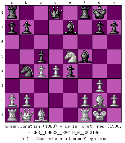 Last move : 0-1 2017 February 22 4:36:38 [Event "FICGS__CHESS__RAPID_A__000196"] [Site "FICGS"] [Date "2016.12.10"] [Round "1"] [White "Green,Jonathan"] [Black "de la Foret,Fred"] [Result "0-1"] [WhiteElo "1988"] [BlackElo "1900"] 1.d4 f5 2.g3 Nf6 3.Bg2 e6 4.c4 Be7 5.Nf3 O-O 6.O-O c5 7.Nc3 Ne4 8.Qd3 Nc6 9.Nxe4 Nb4 10.Qb1 fxe4 11.Qxe4 d5 12.Qb1 e5 13.Nxe5 Bf5 14.e4 dxe4 0-1 This chess game has been lost on time (started : 2016.12.10 10:6:52) Dutch defense Kingside Castling by player Black (move 5) Kingside Castling by player White (move 6) Player Black won this chess game. Follow this game move after move (download)Capture of the adverse King is the ultimate but not the first object of the game. (William Steinitz) Karpov ist ein Museumsstück. (Garry Kasparov) Tu cuerpo tiene que estar en óptima condición. Tu Ajedrez se deteriora como lo hace tu cuerpo. No puedes separar la mente y el cuerpo. (Bobby Fischer) Nous vivons dans un monde échiquéen : chaque jour qui passe est un défi à relever. (Philosophe Sasha) Art disturbs, science reassures. (Georges Braque, Le Jour et la Nuit)
