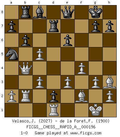 Last move : 1-0 2017 February 28 18:6:59 [Event "FICGS__CHESS__RAPID_A__000196"] [Site "FICGS"] [Date "2016.12.10"] [Round "1"] [White "Velasco,Jose Maria"] [Black "de la Foret,Fred"] [Result "1-0"] [WhiteElo "2027"] [BlackElo "1900"] 1.d4 f5 2.g3 Nf6 3.Bg2 e6 4.c4 Be7 5.Nf3 O-O 6.O-O d6 7.Nc3 Ne4 8.Nxe4 fxe4 9.Nd2 d5 10.f3 e3 11.Nb1 c5 12.Bxe3 cxd4 13.Bxd4 Nc6 14.Bf2 d4 15.e3 d3 16.f4 Bf6 17.Nc3 Bxc3 18.bxc3 Rf7 19.Qb1 d2 20.Rd1 Na5 21.Qb4 Rb8 22.Rab1 b6 23.Rb2 Rd7 24.Bh3 Qe8 25.c5 1-0 This chess game has been lost on time (started : 2016.12.10 10:6:52) Dutch defense Kingside Castling by player Black (move 5) Kingside Castling by player White (move 6) Player White won this chess game. Follow this game move after move (download)I'm not afraid of Spassky. The world knows I'm the best. You don't need a match to prove it. (Bobby Fischer) Ohne Fehler kann es keine Brillanz geben. (Emanuel Lasker) Aunque la mayoría de la gente disfruta observar las partidas de los grandes Maestros de ataque, algunos de los jugadores mas notables en la historia han sido los jugadores silenciosos posicionales. Lentamente ellos te aplastan despojandote de tu espacio, congestionando tus piezas y dejandote virtualmente sin nada que hacer. (Yasser Seirawan) Assurément je connaissais par expérience le mystérieux attrait de ce jeu royal, le seul entre tous les jeux inventés par les hommes qui échappe souverainement à la tyrannie du hasard, le seul où l'on ne doive sa victoire qu'à son intelligence ou plutôt à une certaine forme d'intelligence. Mais n'est-ce pas déjà le limiter injurieusement que d'appeler les échecs un jeu ? N'est-ce pas une science, un art ou quelque chose qui, comme le cercueil de Mahomet entre ciel et terre, est suspendu entre l'un et l'autre, et qui réunit un nombre incroyable de contraires ? [...] C'est une pensée qui ne mène à rien, une mathématique qui n'établit rien, un art qui ne laisse pas d'uvre, une architecture sans matière; et il l'a prouvé néanmoins qu'il était plus durable, à sa manière, que les livres ou que tout autre monument, ce jeu unique qui appartient à tous les peuples et à tous les temps, et dont personne ne sait quel dieu en fit don à la terre pour tuer l'ennui, pour aiguiser l'esprit et stimuler l'âme. Où commence-t-il, où finit-il ? (Stefan Zweig) This is where the fun begins. (Anakin Skywalker in Star Wars ep.3)