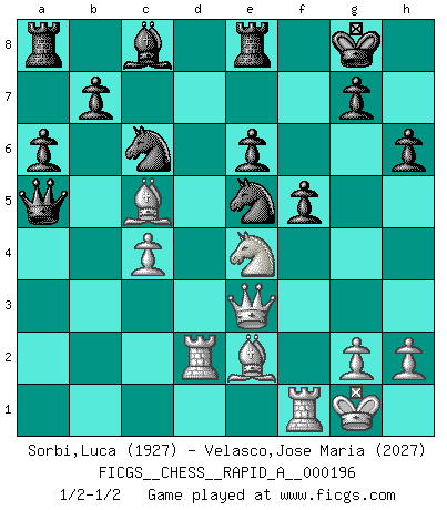 Last move : 1/2-1/2 2017 March 12 19:1:11 [Event "FICGS__CHESS__RAPID_A__000196"] [Site "FICGS"] [Date "2016.12.10"] [Round "1"] [White "Sorbi,Luca"] [Black "Velasco,Jose Maria"] [Result "1/2-1/2"] [WhiteElo "1927"] [BlackElo "2027"] 1.e4 c5 2.Nf3 d6 3.d4 cxd4 4.Nxd4 Nf6 5.Nc3 a6 6.Bg5 e6 7.f4 h6 8.Bh4 Qb6 9.Qd2 Qxb2 10.Rb1 Qa3 11.e5 dxe5 12.fxe5 Nfd7 13.Ne4 Qxa2 14.Rd1 Qd5 15.Qe3 Qxe5 16.Be2 Bc5 17.Bg3 Qd5 18.c4 Bxd4 19.Rxd4 Qa5+ 20.Rd2 O-O 21.Bd6 Rd8 22.Be7 Re8 23.Ba3 Nc6 24.O-O Nde5 25.Bc5 f5 26.Bb6 Qb4 27.Bc5 Qa5 28.Bb6 Qb4 29.Bc5 Qa5 1/2-1/2 Sicilian : Najdorf, 7.f4 Kingside Castling by player Black (move 20) Kingside Castling by player White (move 24) This chess game ended in a draw. Follow this game move after move (download)Examine moves that smite! A good eye for smites is far more important than a knowledge of strategical principles. (Purdy) Warum muß ich gegen diesen IDIOTEN verlieren? (Aaron Nimzowitsch) Yo no creo en la psicología. Yo creo en las buenas movidas. (Bobby Fischer) Les échecs, c'est l'art d'analyser. (Mikhail Botvinnik) Cactus - It is depressed cucumber. (Ilmars Cirulis)