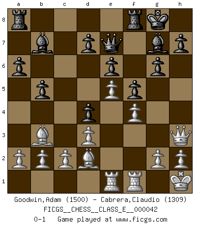 Last move : 0-1 2007 September 5 13:17:20 [Event "FICGS__CHESS__CLASS_E__000042"] [Site "FICGS"] [Date "2007.04.01"] [Round "1"] [White "Goodwin,Adam"] [Black "Cabrera,Claudio"] [Result "0-1"] [WhiteElo "1500"] [BlackElo "1309"] 1.e4 c5 2.Nc3 g6 3.f4 Bg7 4.Nf3 Nc6 5.Bb5 Nd4 6.O-O e6 7.d3 Ne7 8.Nxd4 Bxd4+ 9.Kh1 a6 10.Ba4 b5 11.Bb3 Bb7 12.Bd2 O-O 13.Qf3 f5 14.Qh3 Bg7 15.e5 Nc6 16.Ne2 Qe7 17.Rae1 Nd4 18.Nxd4 cxd4 0-1 This chess game has been lost on time (started : 2007.04.01 1:8:27) Sicilian : Closed Kingside Castling by player White (move 6) Kingside Castling by player Black (move 12) Player Black won this chess game. Follow this game move after move (download)I'm not afraid of Spassky. The world knows I'm the best. You don't need a match to prove it. (Bobby Fischer) Über Frauen: Chess is better. (Robert James Fischer) Bobby Fischer es el mas grande genio de Ajedrez de todos los tiempos. (Alexander Kotov) Les réformistes prétendent que les progrès de la théorie conduiront à la disparition des échecs, et qu'il faut, pour leur rendre vie, en remanier les règles. En réalité, qu'exprime cette affirmation? Le mépris de l'intuition, de l'imagination et de tous les autres éléments qui font des échecs un art. (Alexander Alekhine) I feel so... helpless. (C-3PO in Star Wars ep.3)