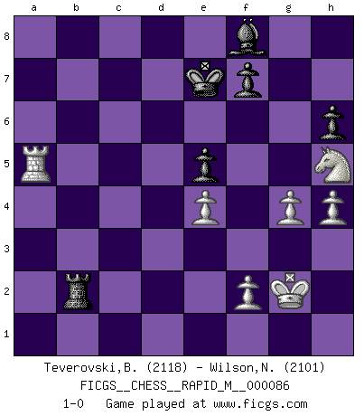 Last move : 1-0 2017 May 4 8:15:53 [Event "FICGS__CHESS__RAPID_M__000086"] [Site "FICGS"] [Date "2016.12.15"] [Round "1"] [White "Teverovski,Bogoljub"] [Black "Wilson,Norman"] [Result "1-0"] [WhiteElo "2118"] [BlackElo "2101"] 1.d4 d5 2.c4 dxc4 3.e4 Nc6 4.Be3 Nf6 5.Nc3 e5 6.d5 Na5 7.Qa4+ c6 8.dxc6 Nxc6 9.Nf3 Bd7 10.Bxc4 Be7 11.O-O O-O 12.h3 Nd4 13.Qd1 Nxf3+ 14.Qxf3 Rc8 15.Bb3 Bc5 16.Rad1 Qe7 17.Bg5 Be6 18.Rd3 h6 19.Bxf6 Qxf6 20.Qxf6 gxf6 21.Rfd1 Rc7 22.g4 Bxb3 23.axb3 Kg7 24.Kg2 Rb8 25.h4 Rc6 26.Rd7 Kf8 27.Ne2 Ke8 28.R1d3 Rb6 29.R7d5 Rc8 30.Ng3 Rbc6 31.Nf5 Bf8 32.b4 a6 33.b5 Rb6 34.bxa6 bxa6 35.b3 Rcb8 36.Rd7 Rb4 37.Ng3 Rxb3 38.Rxb3 Rxb3 39.Ra7 Bc5 40.Rxa6 Rb2 41.Rxf6 Ke7 42.Rf5 Ke6 43.Nh5 Bf8 44.Rf6+ Ke7 45.Ra6 Kd8 46.Ra8+ Ke7 47.Ra5 1-0 QGA : 3.e4 Kingside Castling by player White (move 11) Kingside Castling by player Black (move 11) Player White won this chess game. Follow this game move after move (download)Chess opens and enriches your mind. (Saudin Robovic) Ich kämpfe solange mein Gegner einen Fehler machen kann. (Emanuel Lasker) Puntos débiles o agujeros en la posición de tu oponente deben de ser ocupados por piezas, no Peones. (Siegbert Tarrasch) Des combinaisons [dans le jeu d'échecs] pareilles à des mélodies. Je crois entendre pour ainsi dire la musique des coups... (Vladimir Nabokov) Luck never gives; it only lends. (Swedish proverb)