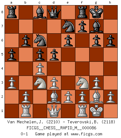 Last move : 0-1 2017 January 7 11:57:29 [Event "FICGS__CHESS__RAPID_M__000086"] [Site "FICGS"] [Date "2016.12.15"] [Round "1"] [White "Van Mechelen,Jan"] [Black "Teverovski,Bogoljub"] [Result "0-1"] [WhiteElo "2210"] [BlackElo "2118"] 1.c4 c5 2.Nc3 g6 3.Nf3 Bg7 4.g3 Nc6 5.Bg2 e6 6.d3 Nge7 7.Bg5 h6 8.Bd2 O-O 9.a3 d5 10.O-O b6 11.Rb1 a5 0-1 English : Symmetrical variation Kingside Castling by player Black (move 8) Kingside Castling by player White (move 10) Player Black won this chess game. Follow this game move after move (download)When you don't know what to do, wait for your opponent to get an idea - it's sure to be wrong. (Tarrasch) Auf jeden Fall musst du zuerst Rechtsanwalt werden, damit du deine eigenen Interessen und die deiner Familie vertreten kannst. [Brief an seinen Sohn] (José Raúl Capablanca) Creo que una cierta cantidad de temperamento es esperada de los genios del Ajedrez. (Ron Gross) Karpov est une pièce de musée. (Garry Kasparov) Patience, use the Force, think ! (Obi-Wan Kenobi in Star Wars ep.2)