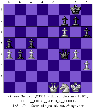 Last move : 1/2-1/2 2017 January 2 17:5:31 [Event "FICGS__CHESS__RAPID_M__000086"] [Site "FICGS"] [Date "2016.12.15"] [Round "1"] [White "Kireev,Sergey"] [Black "Wilson,Norman"] [Result "1/2-1/2"] [WhiteElo "2300"] [BlackElo "2101"] 1.e4 e5 2.Nf3 Nc6 3.Bb5 a6 4.Ba4 Nf6 5.O-O Be7 6.Re1 b5 7.Bb3 d6 8.c3 O-O 9.h3 Bb7 10.d4 Re8 11.Nbd2 Bf8 12.a3 h6 13.Bc2 Nb8 14.b3 Nbd7 15.Bb2 c6 16.Bd3 Nh5 17.Bf1 Nf4 18.Qc2 Ne6 19.c4 exd4 20.Nxd4 Nxd4 21.Bxd4 Rc8 22.Rab1 a5 23.g3 b4 24.a4 Qc7 25.Rbd1 Rcd8 26.Bg2 Be7 27.Kh2 Bc8 28.f4 c5 29.Ba1 Bb7 30.Nf1 Bf6 31.Bxf6 Nxf6 32.g4 d5 33.e5 dxc4 34.Bxb7 Rxd1 35.Qxd1 Qxb7 36.exf6 Rxe1 37.Qxe1 Qb8 38.bxc4 Qxf4+ 39.Kg1 1/2-1/2 Ruy Lopez : Closed Kingside Castling by player White (move 5) Kingside Castling by player Black (move 8) This chess game ended in a draw. Follow this game move after move (download)Chess is like war on a board. (Bobby Fischer) Ich verstehe Aljechins Kombinationen ganz gut; aber woher er diese Angriffschancen bekommt und wie er die Eröffnung behandelt das ist für mich ein Buch mit sieben Siegeln. (Rudolf Spielmann) Realmente no sabemos como el juego fue inventado, aunque hay sospechas. Tan pronto como descubramos a los culpables, se los haremos saber. (Bruce Pandolfini) Les écrivains ont utilisé les échecs pour analyser les côtés extrêmes de la nature humaine. Dans ce cadre, les échecs offrent un champ d'expérimentation idéal. Mais on pourrait faire la même chose avec la peinture. Et là, en vous référant à Van Gogh, vous ne tirerez pas de conclusion définitive sur les peintres. (Gary Kasparov) It is not enough to be a good player... you must also play well. (Siegbert Tarrasch)