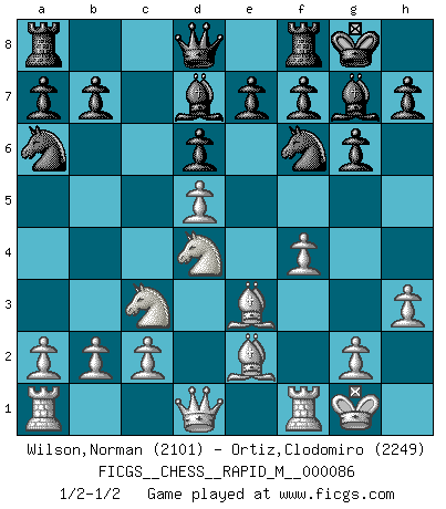 Last move : 1/2-1/2 2016 December 27 21:16:20 [Event "FICGS__CHESS__RAPID_M__000086"] [Site "FICGS"] [Date "2016.12.15"] [Round "1"] [White "Wilson,Norman"] [Black "Ortiz,Clodomiro"] [Result "1/2-1/2"] [WhiteElo "2101"] [BlackElo "2249"] 1.e4 g6 2.d4 Bg7 3.Nc3 d6 4.f4 Nf6 5.Nf3 O-O 6.Bd3 Nc6 7.Be2 Bg4 8.d5 Nb8 9.Be3 c6 10.O-O cxd5 11.exd5 Na6 12.h3 Bd7 13.Nd4 1/2-1/2 Robatsch defense : Pseudo-Austrian attack Kingside Castling by player Black (move 5) Kingside Castling by player White (move 10) This chess game ended in a draw. Follow this game move after move (download)It is peculiar but a fact nevertheless, that gamblers in chess always have enthusiastic followers. (Botvinnik) Ich bin Weltmeister und muß mit niemandem irgend etwas diskutieren. (Viswanathan Anand) Te sientas frente a un tablero y repentinamente tu corazón brinca. Tu mano tiembla al tomar una pieza y moverla. Pero lo que el Ajedrez te enseña es que tu debes permanecer ahí con calma y pensar de que si realmente es una buena idea o de que si hay otras ideas mejores. (Stanley Kubrick) Les ravages du H expliquent la différence de niveau entre Tal et Thal [Abergel]. A woman without a man is like a fish without a bicycle. (Gloria Steinem)