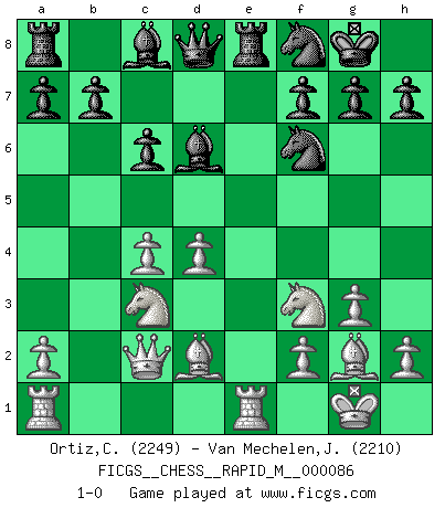 Last move : 1-0 2017 January 1 13:44:51 [Event "FICGS__CHESS__RAPID_M__000086"] [Site "FICGS"] [Date "2016.12.15"] [Round "1"] [White "Ortiz,Clodomiro"] [Black "Van Mechelen,Jan"] [Result "1-0"] [WhiteElo "2249"] [BlackElo "2210"] 1.d4 Nf6 2.c4 e6 3.g3 d5 4.Nf3 Bb4+ 5.Bd2 Bd6 6.Bg2 O-O 7.O-O c6 8.Nc3 Nbd7 9.b3 Re8 10.Qc2 dxc4 11.bxc4 e5 12.e3 exd4 13.exd4 Nf8 14.Rfe1 1-0 Catalan Opening Kingside Castling by player Black (move 6) Kingside Castling by player White (move 7) Player White won this chess game. Follow this game move after move (download)Bobby Fischer is the greatest Chess player who has ever lived. (Ken Smith) Ich würde mich als ganz normalen Jungen bezeichnen [Im Alter von 12]. (Sergej Karjakin) El pensamiento metódico es mas útil en el Ajedrez que la inspiración. (C. J. S. Purdy) Lorsque vous vous retrouvez devant une position atroce, ne tendez pas un ultime piège dérisoire avec l'intention d'abandonner si l'adversaire le déjoue ! Faites-vous plutôt un devoir de résister comme si votre vie en dépendait. Jouez le coup qui vous déplairait au centuple si vous étiez dans la peau de votre tortionnaire ! If you work for a living, why do you kill yourself working ? (Tuco to a chicken in The Good, The Bad and The Ugly)