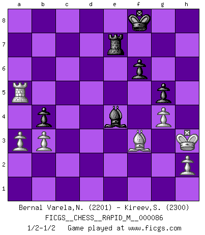Last move : 1/2-1/2 2017 March 1 16:54:32 [Event "FICGS__CHESS__RAPID_M__000086"] [Site "FICGS"] [Date "2016.12.15"] [Round "1"] [White "Bernal Varela,Nelson"] [Black "Kireev,Sergey"] [Result "1/2-1/2"] [WhiteElo "2201"] [BlackElo "2300"] 1.e4 e5 2.Nf3 Nc6 3.Bb5 a6 4.Ba4 Nf6 5.O-O Be7 6.Re1 b5 7.Bb3 O-O 8.c3 d5 9.exd5 Nxd5 10.Nxe5 Nxe5 11.Rxe5 c6 12.d4 Bd6 13.Re1 Qh4 14.g3 Qh3 15.Qe2 Bd7 16.Qf1 Qf5 17.c4 Nf6 18.Nc3 Rae8 19.Be3 h5 20.c5 Bb8 21.Qg2 h4 22.Rac1 h3 23.Qf1 a5 24.Bc2 Qh5 25.a3 Be6 26.b3 Nd5 27.Bd1 Nxe3 28.fxe3 Qg5 29.Ne4 Qh6 30.Nd6 Bxd6 31.cxd6 Bd7 32.Qf4 Re6 33.Qxh6 Rxh6 34.Bf3 Rxd6 35.Rc5 Rf6 36.Rf1 Re8 37.e4 Rd6 38.Rd1 f6 39.Kf2 Kf8 40.Rd3 g5 41.g4 Re7 42.Kg3 Be8 43.Kxh3 Bg6 44.d5 cxd5 45.Rcxd5 Rxd5 46.Rxd5 b4 47.Rxa5 Bxe4 1/2-1/2 Ruy Lopez : Closed, 7...O-O Kingside Castling by player White (move 5) Kingside Castling by player Black (move 7) This chess game ended in a draw. Follow this game move after move (download)With or without the title, Bobby Fischer was unquestionably the greatest player of his time. (Burt Hochberg) Die Leute spielen gegen mich seit 15 Jahren unter Ihren Möglichkeiten. (Robert James Fischer) El Ajedrez es de 30 a 40 por ciento psicología. Uno no cuenta con esto cuando se juega contra una computadora. No lo puedo confundir. (Judith Polgar) On entre au jeu d'Echecs comme on entre en Religion. Pour le joueur d'Echecs, la partie d'Echecs c'est l'office, la messe, le défilé du 1er Mai, le dépôt de gerbe au Monument aux Morts. C'est un drame sacré. (Michel Roos) Home computers are being called upon to perform many new functions, including the consumption of homework formerly eaten by the dog. (Doug Larson)
