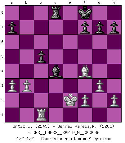 Last move : 1/2-1/2 2017 February 3 19:56:12 [Event "FICGS__CHESS__RAPID_M__000086"] [Site "FICGS"] [Date "2016.12.15"] [Round "1"] [White "Ortiz,Clodomiro"] [Black "Bernal Varela,Nelson"] [Result "1/2-1/2"] [WhiteElo "2249"] [BlackElo "2201"] 1.d4 Nf6 2.c4 e6 3.g3 Bb4+ 4.Nd2 d5 5.Bg2 O-O 6.Ngf3 b6 7.O-O Bb7 8.b3 c5 9.Bb2 Qe7 10.cxd5 Bxd5 11.e4 Nxe4 12.Nxe4 Bxe4 13.Qe2 Bd5 14.a3 Ba5 15.Ne5 Rd8 16.dxc5 bxc5 17.Rfd1 Nd7 18.Rxd5 exd5 19.Bxd5 Nxe5 20.Bxa8 Rxa8 21.Qxe5 Qxe5 22.Bxe5 Rd8 23.Bf4 Bc3 24.Rc1 Bd4 25.Kf1 Kf8 26.Ke2 1/2-1/2 Catalan Opening Kingside Castling by player Black (move 5) Kingside Castling by player White (move 7) This chess game ended in a draw. Follow this game move after move (download)Life is a kind of Chess, with struggle, competition, good and ill events. (Benjamin Franklin) Ein unbeabsichtigtes Patt ist der Gipfel der Dummheit. (Anonymous) Uno no tiene que jugar muy bien, es suficiente jugar mejor que el oponente. (Siegbert Tarrasch) Les Echecs ne sont pas pour les âmes timides. Ils requièrent un homme entier, qui ne s'arrête pas aveuglément à ce qui a été déjà établi, mais qui tente individuellement de sonder les profondeurs du jeu. (W. Steinitz) You cannot beat a roulette table unless you steal money from it. (Albert Einstein)