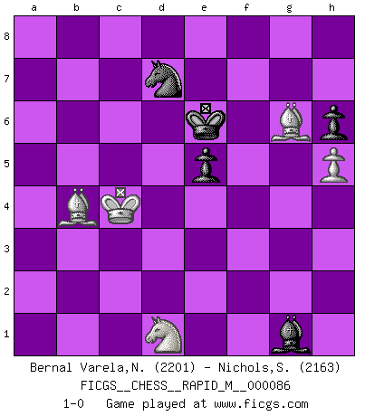 Last move : 1-0 2017 January 30 18:7:53 [Event "FICGS__CHESS__RAPID_M__000086"] [Site "FICGS"] [Date "2016.12.15"] [Round "1"] [White "Bernal Varela,Nelson"] [Black "Nichols,Scott"] [Result "1-0"] [WhiteElo "2201"] [BlackElo "2163"] 1.e4 c5 2.Nf3 d6 3.d4 cxd4 4.Nxd4 Nf6 5.Nc3 a6 6.Be2 e5 7.Nb3 Be7 8.Be3 O-O 9.g4 Be6 10.g5 Nfd7 11.h4 Nc6 12.Nd5 Rc8 13.c3 Qe8 14.Nd2 f5 15.f3 Na5 16.b4 fxe4 17.fxe4 Bxd5 18.exd5 Rxc3 19.Bf2 Qf7 20.Rf1 Qxd5 21.Rc1 Rxc1 22.Qxc1 Qxa2 23.Qc3 d5 24.bxa5 Qa4 25.Bg3 Bb4 26.Rxf8+ Kxf8 27.Qf3+ Ke7 28.Qxd5 Qxa5 29.Qxa5 Bxa5 30.Kd1 b5 31.Ne4 Ke6 32.Bg4+ Kd5 33.Bf3 Nf8 34.Nf2 Kd4 35.Bb7 Bc3 36.Bxa6 b4 37.Ng4 Ng6 38.Kc2 Nf4 39.Bf2+ Ke4 40.Bb7+ Kf5 41.Ne3+ Ke6 42.Be4 h6 43.Nd1 Bd4 44.gxh6 gxh6 45.Be1 Bc5 46.Kb3 Nd5 47.Kc4 Nf6 48.Bg6 Nd7 49.h5 Bg1 50.Bxb4 1-0 Sicilian : Najdorf, Opovcensky variation Kingside Castling by player Black (move 8) 10 pieces endgame at move 50 : White KBBNP , Black KBNPP WHITE : King + 2 Bishops 1 Knight 1 Pawn BLACK : King + 1 Bishop 1 Knight 2 Pawns Player White won this chess game. Follow this game move after move (download)We like to think. (Gary Kasparov) Ich tröste mich mit dem Vergnügen, daß Schachfans, Zuschauer und Leser glücklich sind, wenn ein Großmeister etwas riskiert, statt nur Klötzchen zu schieben. (Mikhail Nekhemyevich Tal) El Ajedrez se juega con la mente... ¡no con las manos!. (Renaud y Kahn) Si le désir cupide (et stupide) de gagner est une inépuisable source de souffrance, une combinaison brillante sur l'échiquier est une découverte : le coquelicot qui s'épanouit lorsque apparaît la Voie Lactée. (Arrabal) Waiting for chance ? Play in casinos. (FICGS proverb)