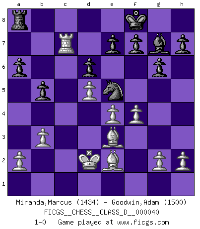 Last move : 1-0 2007 May 1 19:56:39 [Event "FICGS__CHESS__CLASS_D__000040"] [Site "FICGS"] [Date "2007.04.01"] [Round "1"] [White "Miranda,Marcus"] [Black "Goodwin,Adam"] [Result "1-0"] [WhiteElo "1434"] [BlackElo "1500"] 1.e4 c5 2.Nf3 g6 3.c4 Nc6 4.d4 cxd4 5.Nxd4 Nf6 6.Nc3 d6 7.Be2 Nxd4 8.Qxd4 Bg7 9.Bg5 O-O 10.Qd2 Be6 11.Rc1 Qa5 12.f3 Rfc8 13.b3 a6 14.Na4 Qxd2+ 15.Kxd2 Rc6 16.Nc3 Kf8 17.Be3 Nd7 18.Nd5 Bxd5 19.cxd5 Rxc1 20.Rxc1 Ne5 21.Rc7 b5 22.f4 1-0 Sicilian : Hungarian variation Kingside Castling by player Black (move 9) Player White won this chess game. Follow this game move after move (download)Chess is really ninety nine percent calculation. (Soltis) Gott hat gewollt, dass ich Champion werde. (Surab Azmajparaschvili) Nunca nadie ha ganado una partida de Ajedrez rindiendose. (Unknown) La solitude du joueur d'Echecs à l'approche du mat est semblable à celle du condamné. (Francis Szpiner) Plans are ideas that never come to fruition. (Daniel Parmet)