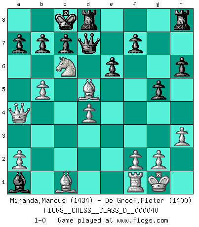Last move : 1-0 2007 April 27 19:24:50 [Event "FICGS__CHESS__CLASS_D__000040"] [Site "FICGS"] [Date "2007.04.01"] [Round "1"] [White "Miranda,Marcus"] [Black "De Groof,Pieter"] [Result "1-0"] [WhiteElo "1434"] [BlackElo "1400"] 1.e4 d5 2.exd5 Nf6 3.d4 Bg4 4.Nf3 Qxd5 5.Be2 Nc6 6.h3 Bxf3 7.Bxf3 Qd7 8.c3 O-O-O 9.Qb3 e6 10.Nd2 Na5 11.Qc2 h6 12.b4 Nc6 13.Nb3 Bd6 14.O-O g5 15.b5 Ne7 16.Na5 Ned5 17.c4 Bb4 18.Qa4 Bc3 19.cxd5 Nxd5 20.Nc6 Bxa1 21.Bxd5 1-0 Scandinavian defense Queenside Castling by player Black (move 8) Kingside Castling by player White (move 14) Player White won this chess game. Follow this game move after move (download)Some part of a mistake is always correct. (Savielly Tartakover) Schach sollte überall auf der Welt Schulfach werden. Es fördert die geistige Auseinandersetzung. Es lehrt die Demut in der Niederlage. (Garry Kasparov) Todos los jugadores de Ajedrez deberían tener un pasatiempo. (Savielly Tartakower) 'L'échange des dames est un coup dur pour les deux adversaires...' Un journaliste lors d'une partie du match Spassky-Fischer To steal ideas from one person is plagiarism. To steal from many is research. (Unknown)